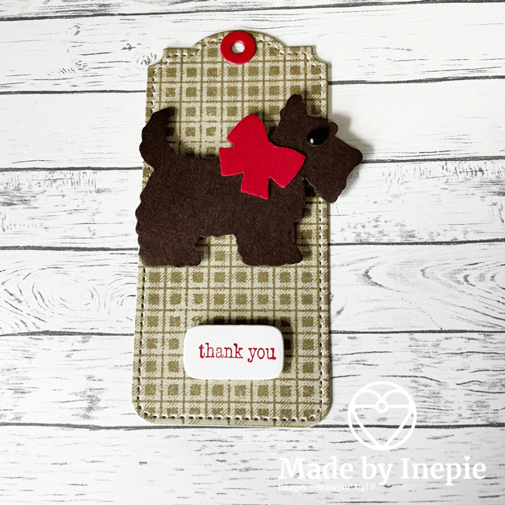 De laatste label is ook uit Crumb Cake cardstock gestanst. Hier eerst de achtergrond op gestempeld en toen een hondje wat ik over had erop geplakt met Dimensionals. Ik had nog een wit stansje over volgens mij van de caravan stans en heb hierop Thank You gestempeld. Deze kleine tekst komt uit de Through it Together stempelset: hier zitten prachtige teksten in je vindt hem op pagina 69 van de jaarcatalogus.