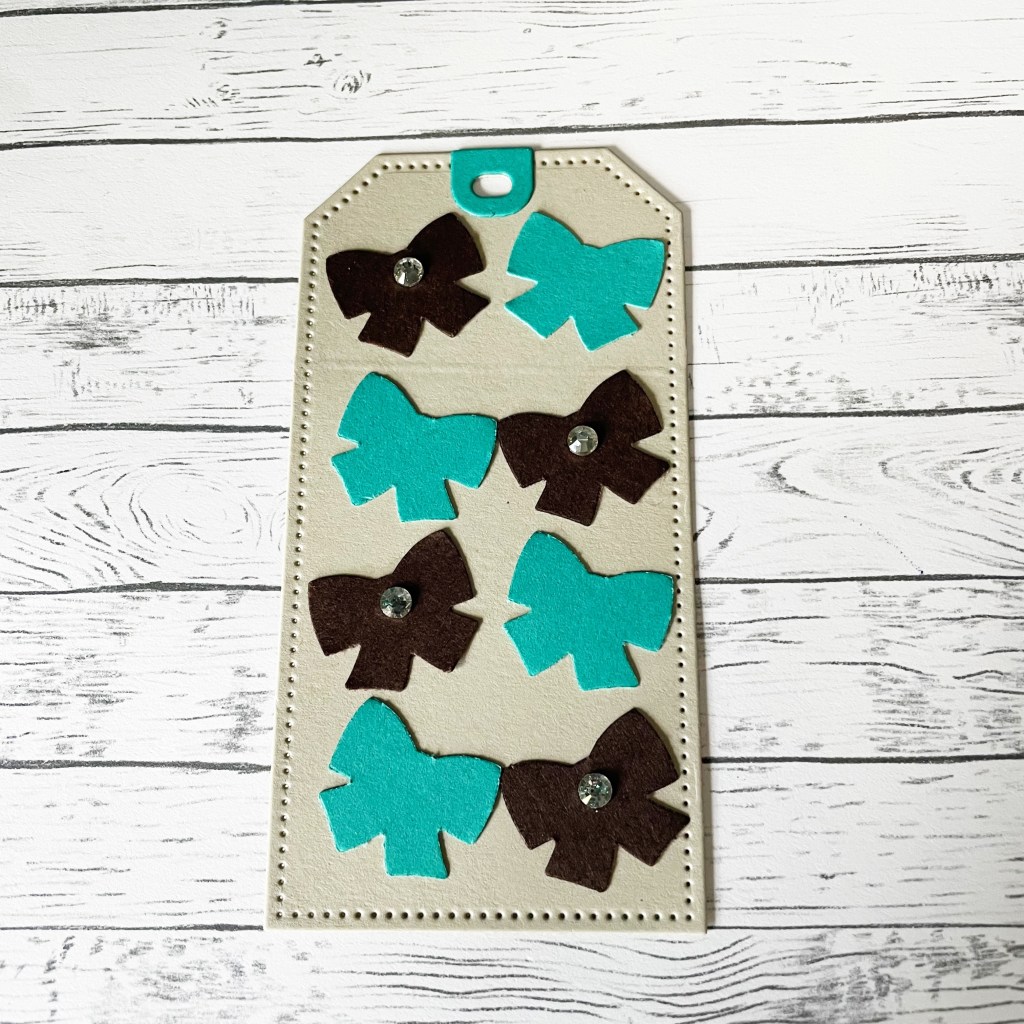Mijn tweede label heb gemaakt met deScottie dog pons. Alleen de strikjes gebruikt in Early Espresso en Bermuda Bay. Dit geplakt op het label gemaakt van een restje Crumbcake. Dit is de strakkere uitvoering van de Tailor Tag Dies. Voor de Blingbling nog wat Rhinestones erop. Snel en simpel maar met een mooi eindresultaat