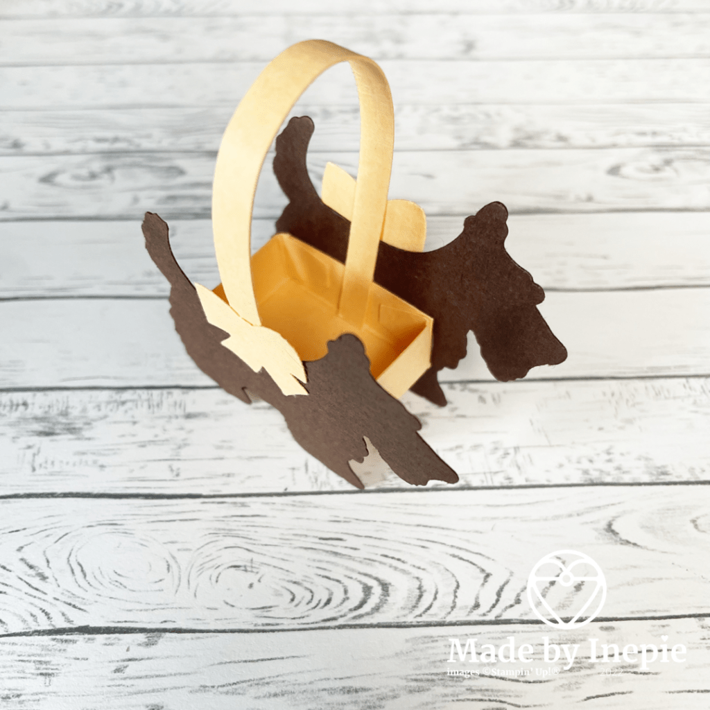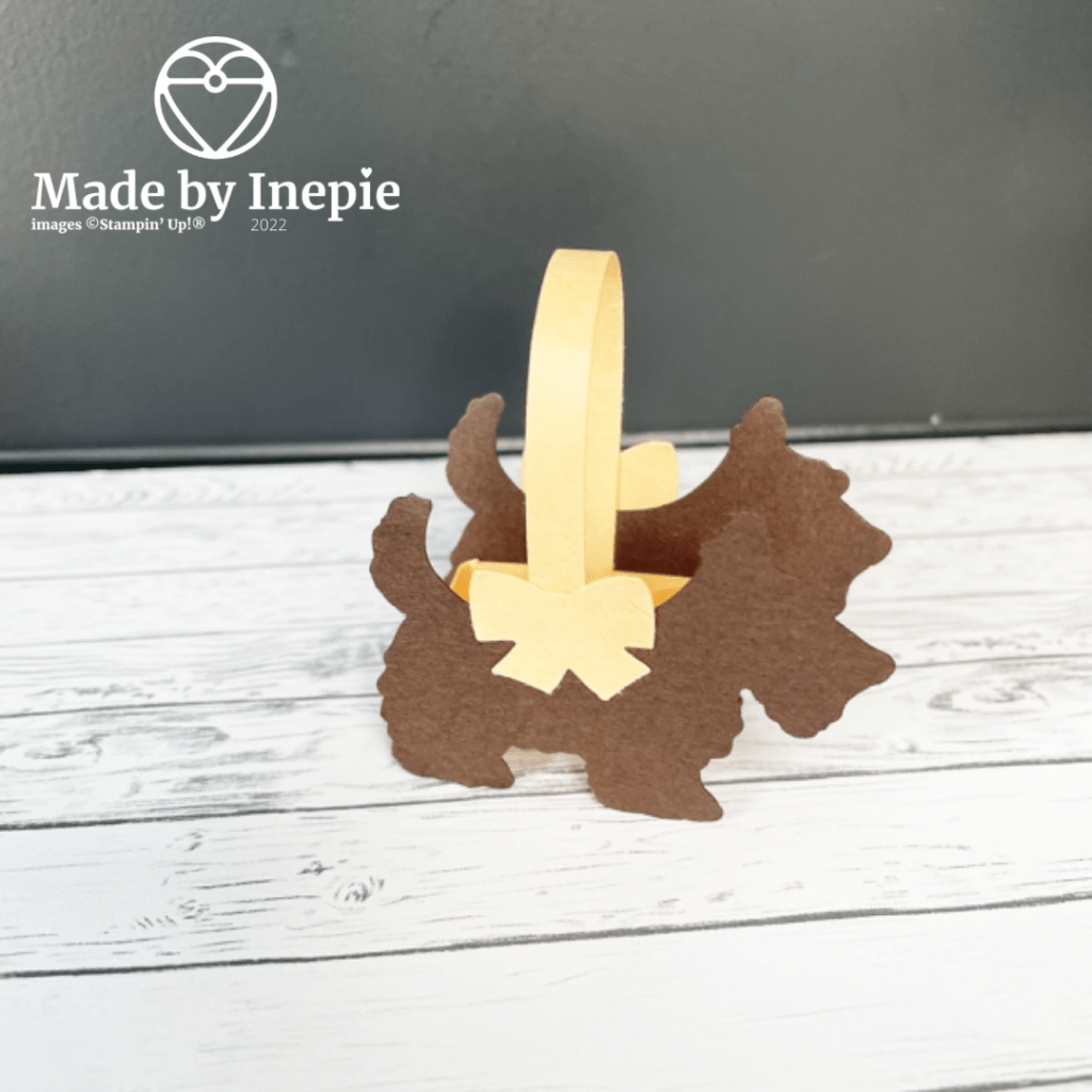 Gewoon een reststukje cardstock van 4 cm bij 5 cm gesneden en op 4 kanten rillen op 1 cm. Vouwen en inknippen en bakje vormen. De hondjes aan de zijkanten opplakken Strip van 1 cm cardstock met je bonefolder wat rond maken en in de mand plakjen. 2 strikjes erop om het af te maken. So cute!