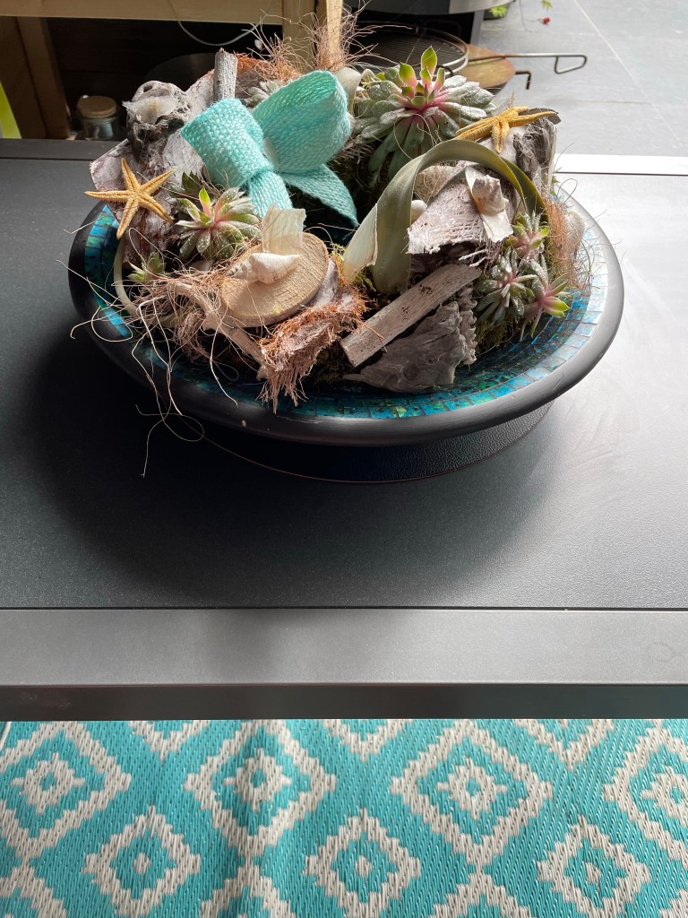 De schaal had ik al en daar past de krans perfect in. Dit is echt een Madebyinepie project geworden. Het hout, de zeesterren en de schelpen, brengen mooie herinneringen terug aan de zee. En de kleur strik past ook perfect bij mijn tuinkleed.