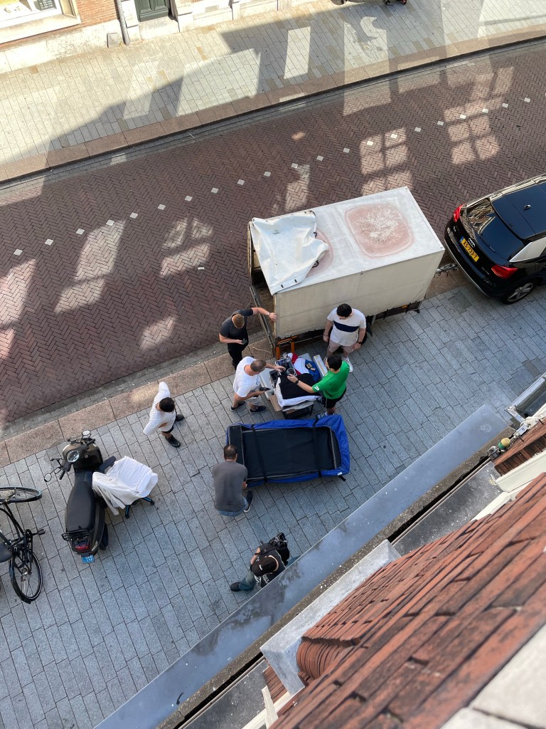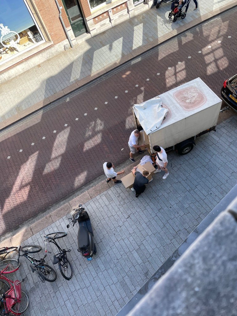 Met drie smalle trappen was het echt lastig maar onze twee sterke mannen Teun en Gert-Jan klaarden de klus: toppers! Dit was de leenbank maar gelukkig wordt de grote bank met lounge gedeelte bezorgd en boven gebracht.