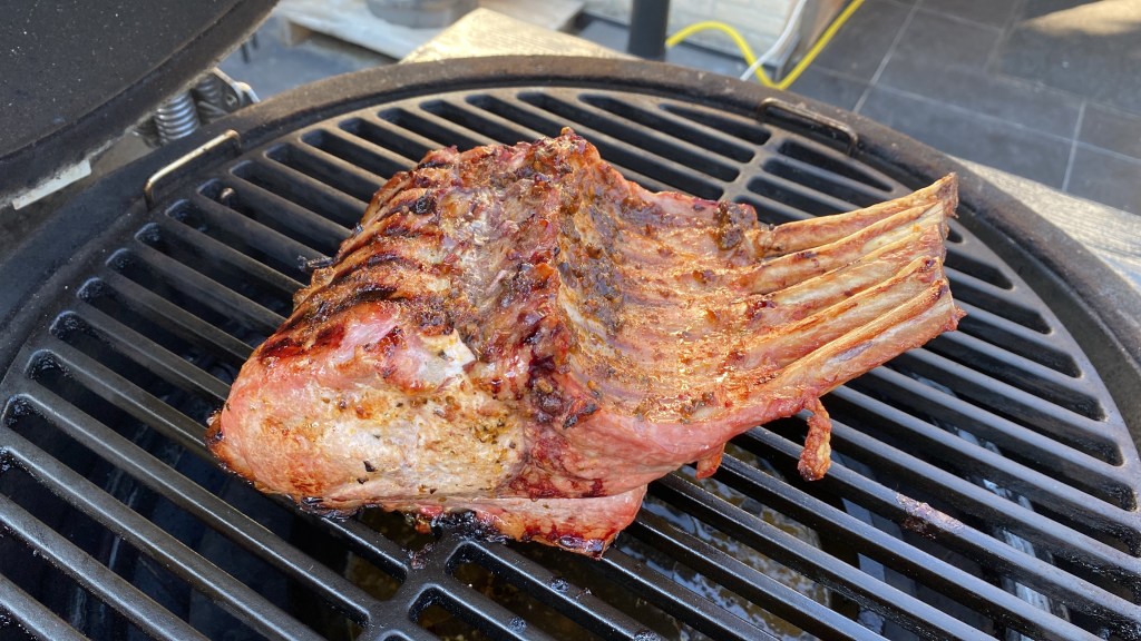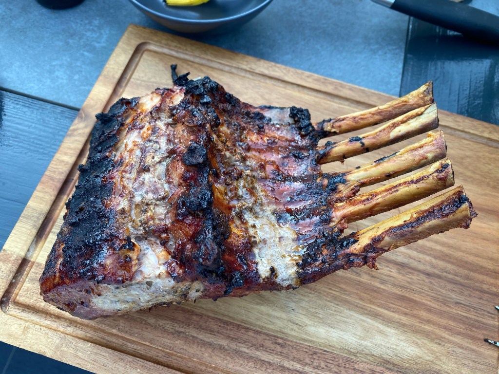Als voorgerecht hadden we meloen met ham. Daarna een frisse salade met warme ossehaaspuntjes En de mannen hadden als tussen gerecht garnalen Pil Pil. Ondetussen zat het varkens rack op de bbq lekker te garen. Willem had die zelf gemarineerd.
