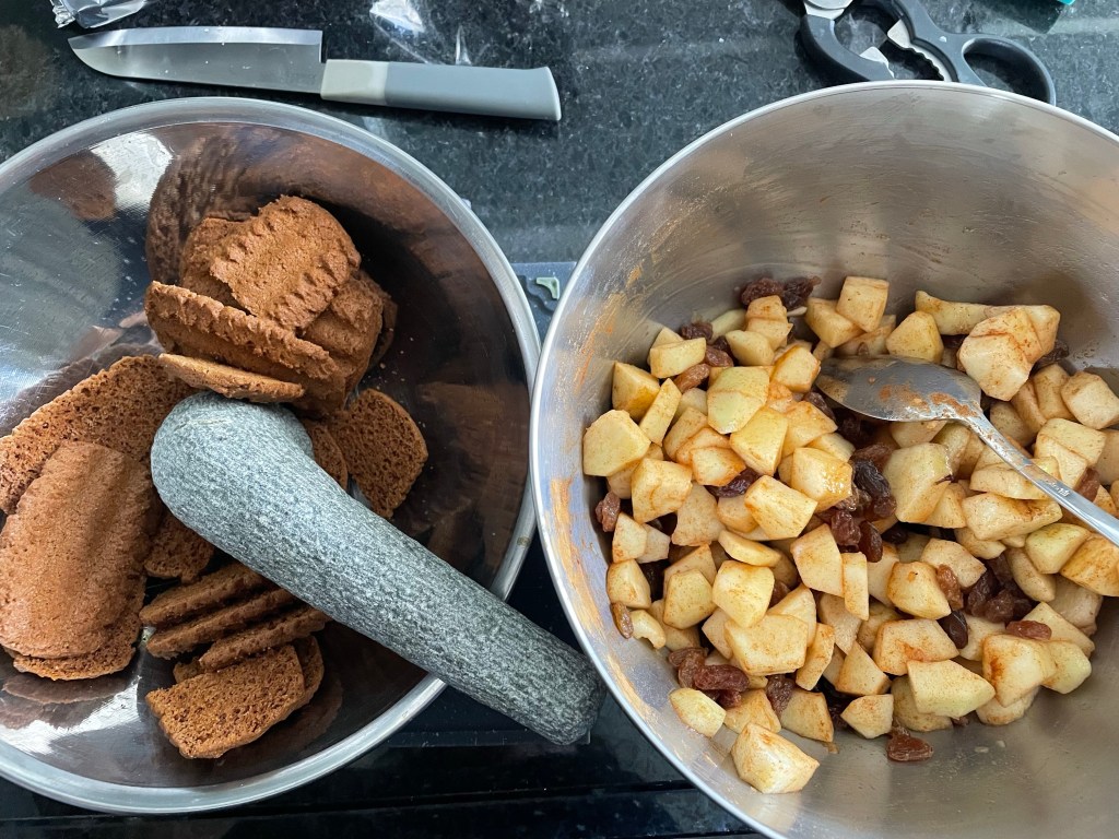 S’middags de bastognekoeken fijn gestampd. De appels geschild en in stukjes gesneden en daarna de apoels met rozijnen bestrooid met kaneel en laten weken in sinaasappelsap en wat Passoa. In mijn aardewerk pannetjes een bodem van de verkruimelde Bastogne koeken gedaan met wat gesmolten blueband. En daar het appel mengsel over verdeeld. Na 15 minuten in de oven op 209 graden was het klaar. S’avonds heb ik ze nog even 6 minuten in de oven terug gedaan en geserveerd met twee bolletjes vanille-ijs. Willem wilde er nog slagroom bij lol maar wij vonden het zo al lekker. Het idee heb ik van ons favoriete restaurant Sopranos waar dit gerecht mijn favoriete toetje is