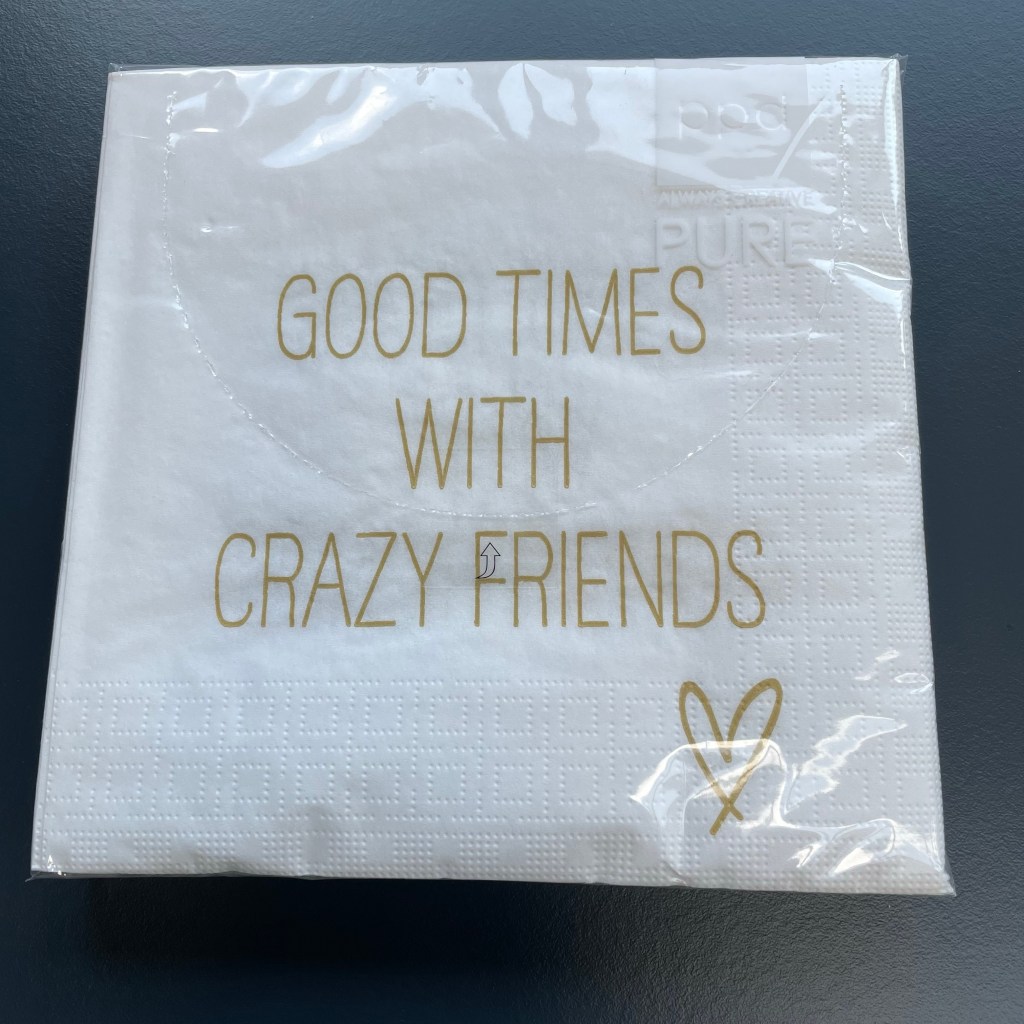 Gisterenavond kwamen onze vrienden Aggie en Geert langs voor een gezellig avondje. Als cadeautje namen ze een fles likeur mee en deze mooie servetten. Geweldig. Nu is alleen nog de vraag wie van de twee vrienden stellen de crazy ones zijn haha. Geert zei nog dat hij had gezocht naar de omgekeerde tekst: crazy times with good friends maar die hadden ze niet. Nou wij hebben er hartelijk om gelachen en Willems motto: een dag niet gelachen is een dag niet geleefd dus mooi waar gemaakt.