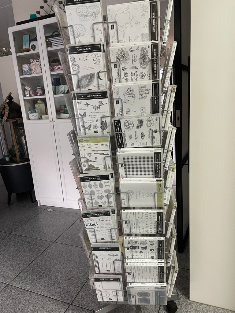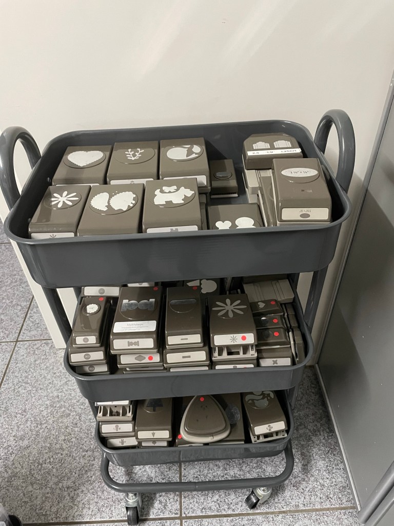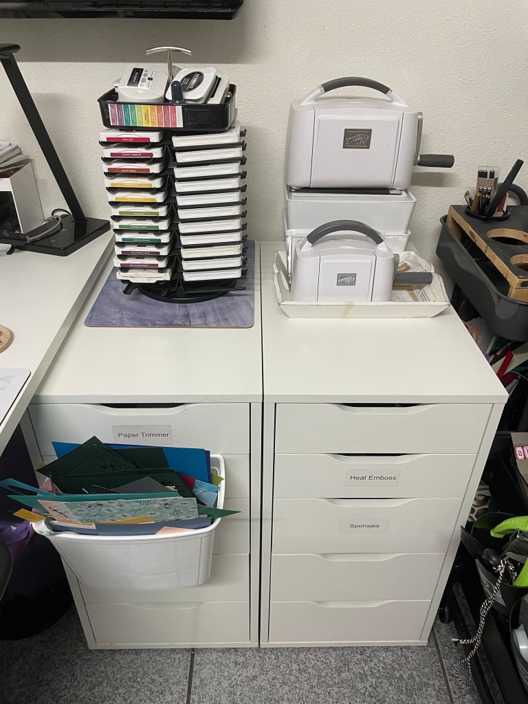 Ik had het heel lang uitgesteld maar nu dus eindelijk begonnen aan het opruimen van mijn studio. Ik kon gewoon dingen niet meer vinden en werken aan de tafels of bureau ging echt niet meer. Dus zat ik weer in de huiskamer te knutselen. Zaterdag komen vier Stampin’Up! Vriendinnen mijn verjaardag vieren dus had ik een stok achter de deur hihi. Dus eerst mijn ponsen wagen uitgezocht. Ik was mijn tabpons kwijt en gelukkig nu terug gevonden. Alles weer netjes georganiseerd en stickers op de retired ponsen geplakt en de sticker van de Pinquin pons afgehaald want die staat weer in de minicatalogus!
