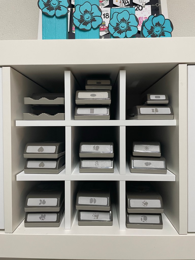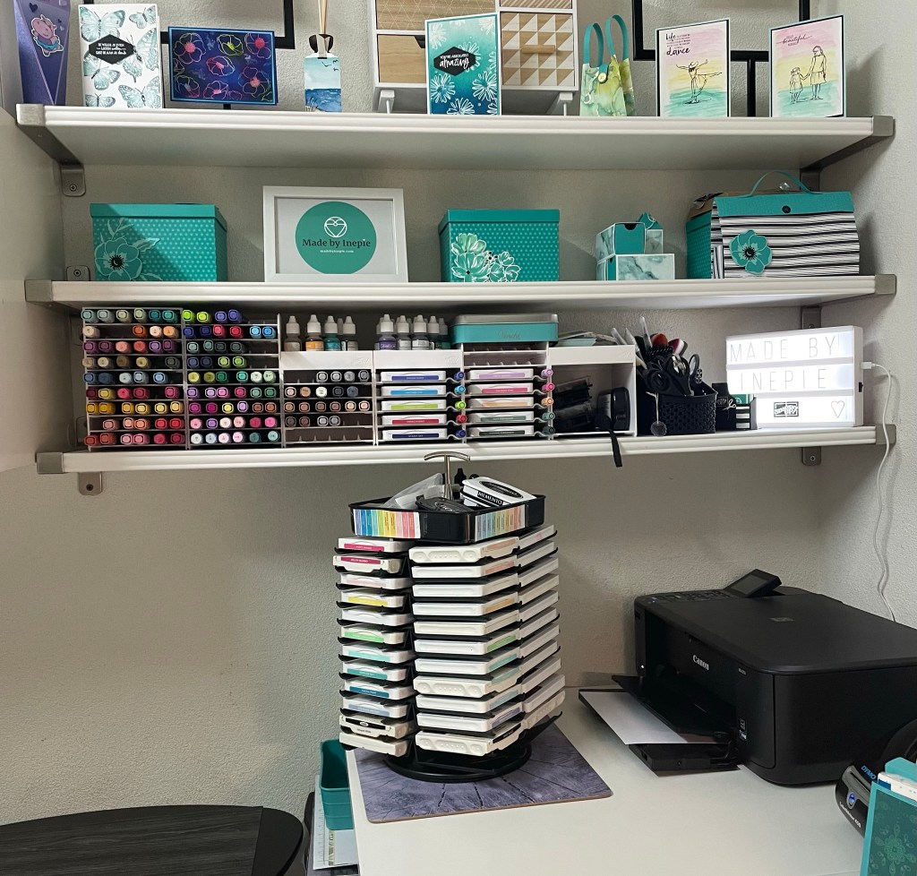 Ik heb meer ruimte bij mijn bureau omdat ik nu de Cut en Emboss machines op de nieuwe plank heb gezet. En de Stampin Blends en inktpads staan nu links. Veel makkelijker om te pakken nu.