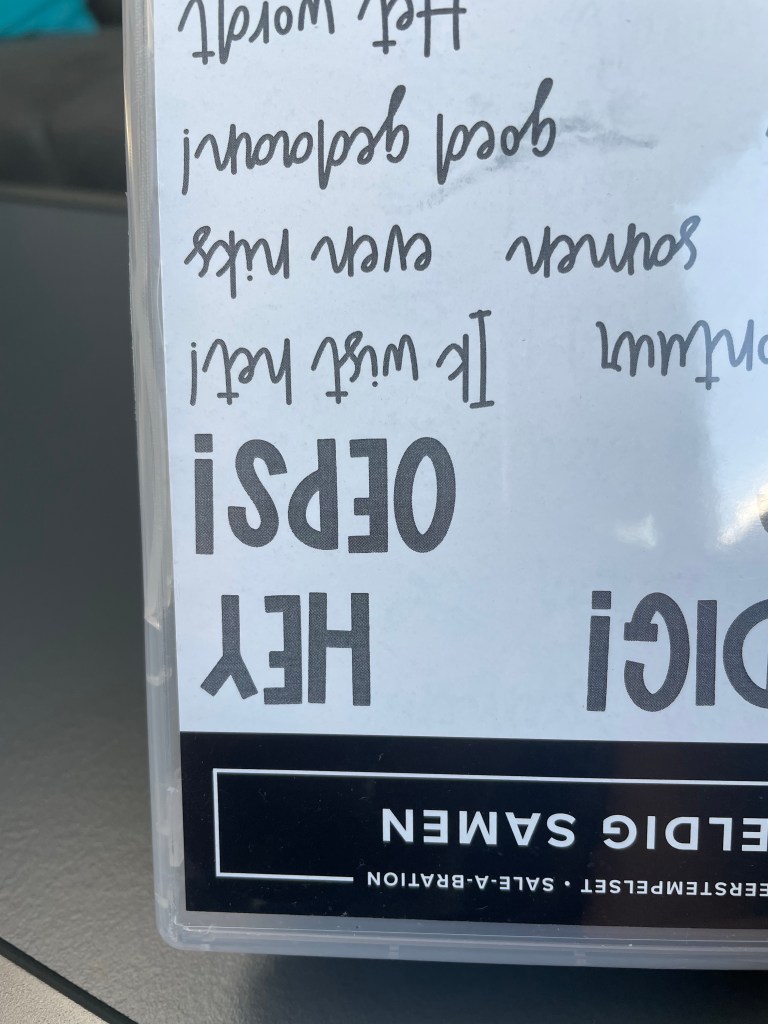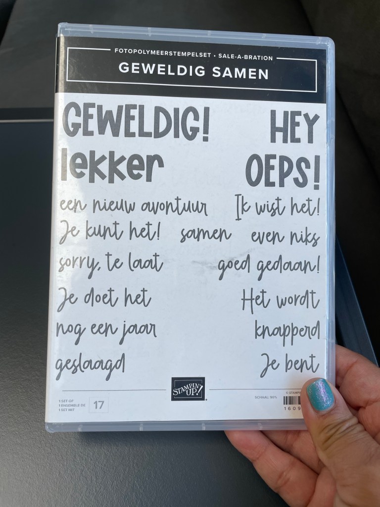 Deze grote letters had ik uitgestanst uit het mooie Thee en Trend dsp. En het stuk waar ik de letters uit had gestanst heb ik op een basis kaart van Basic White geplakt. Het woord Geweldig heb ik gestempeld met de gratis tijdens Sale-A-Bration te verdienen stempelset: Geweldig samen. In die stempelset zat ook de tekst : je bent. Maar ik vond Oma is geweldig, leuker. Dus heb ik Oeps! gestempeld en daarna los geknipt en het uitroepteken werd een I. Zo kun je verschillende teksten maken bijvoorbeeld: Lekker weg! En dan de caravan erbij plakken. Of Het wordt Gekker ipv Lekker. En ook Hippo en zo’n leuk nijlpaardje erbij plakken en ga zo maar door.