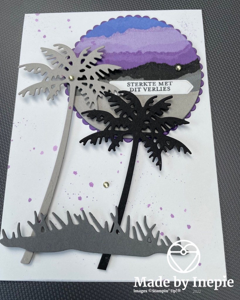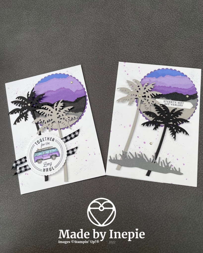 Voor de andere kaart heb ik net als Cindy de leuke VW bus gebruikt. En bij beide kaarten gebruik gemaakt van de Palm Dies. En spetters gemaakt met Highland Heather inkt.