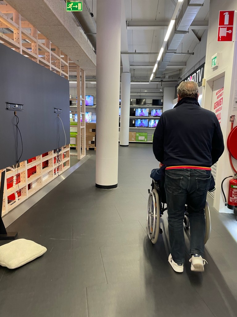 Het werd al laat dus gauw naar Boxtel gereden. Willem had ook een groter toetsenbord voor haar besteld en die heb ik voor haar aangesloten terwijl Willem de tv installeerde. Ze was toen eigenlijk te moe, het was natuurlijk een hele vermoeiende dag voor haar geweest. En ik voelde de dag erna ook overal spierpijn door het duwen van de rolstoel. Willem moest natuurlijk de tv dragen. En dan merk je ook hoe lastig het is als je in een rolstoel zit. Vaak hebben zaken trapjes en geen rolstoel toegang.