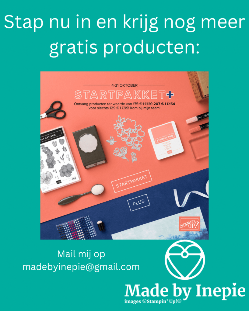 Waar ik ook trots op ben is mijn werk al Stampin’Up! Demonstratrice. Van de week een mooie bestelling mogen wegdoen. Weer 11 klanten blij kunnen maken met de geweldige Birthday Card Organize kit. Wil jij dit ook? Stampin’Up! Heeft weer een geweldige instap actie: als je nu instapt in mijn team betaal je €129,00 en normaal mag je dan voor €175,00 aan producten uitzoeken maar deze maand zelfs voor € 207,00 en de verzendkosten zijn ook gratis. Naast jouw keuze krijg je ook alle business materialen die je nodig hebt om te starten. Wil jij geen actieve Demo zijn maar een hobby demo kan dat ook. Dan profiteer je nu gewoon van deze super aanbieding en de korting die je als Demo krijgt. Wil je meer doen met je Demoschap help ik jou natuurlijk om meer te bereiken. Je bent van harte welkom in team Madebyinepie.