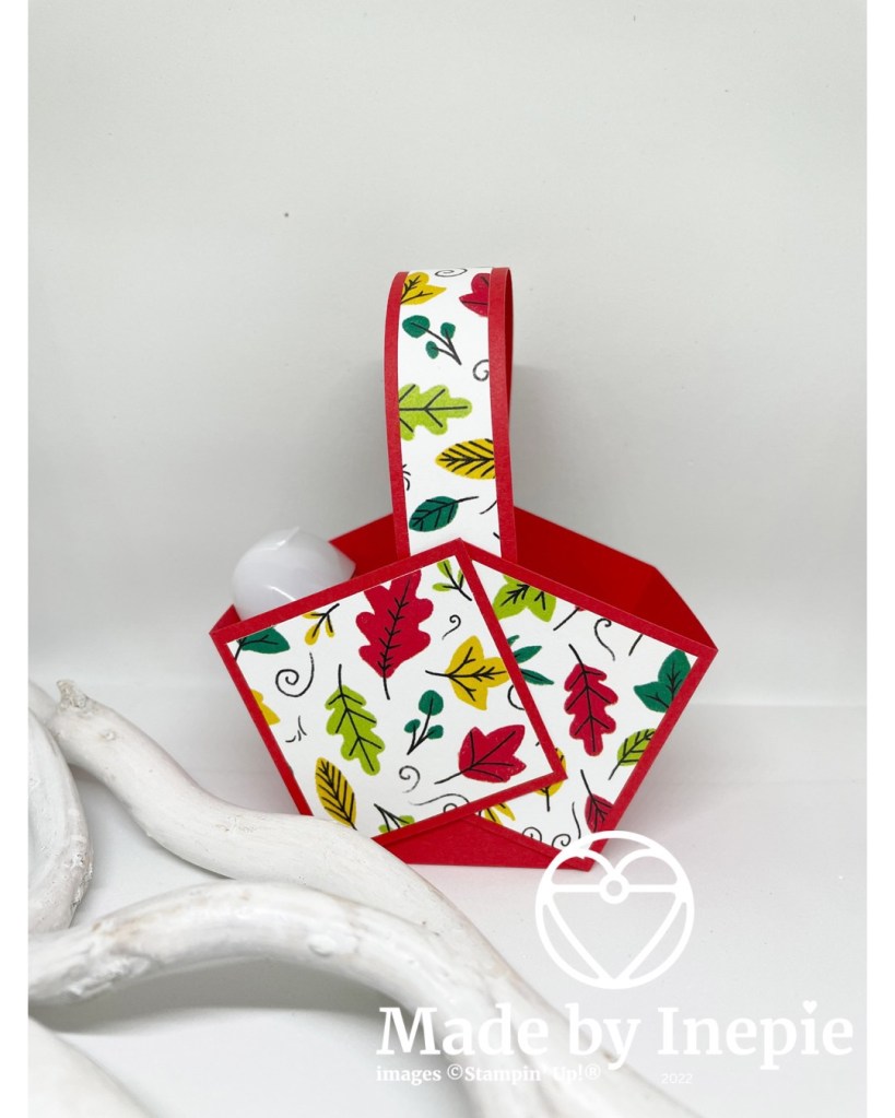 Nu even mijn doosje of eigenlijk mandje van vandaag showen. Dit is een oud modelletje maar door het Celebrate Everything Dsp van nu te gebruiken, is hij weer helemaal modern. En vooral met deze herfst blaadjes en het mooie Poppy Parade knalt hij van het scherm. Ik heb er even een flesje handgel ingedaan maar dit mandje vullen met chocolade is natuurlijk ook erg leuk. Ook kun je natuurlijk er nog een label op doen met een tekst maar ik wilde dat het Dsp in de hoofdrol stond zoals deze hele week. Soms is Less more!