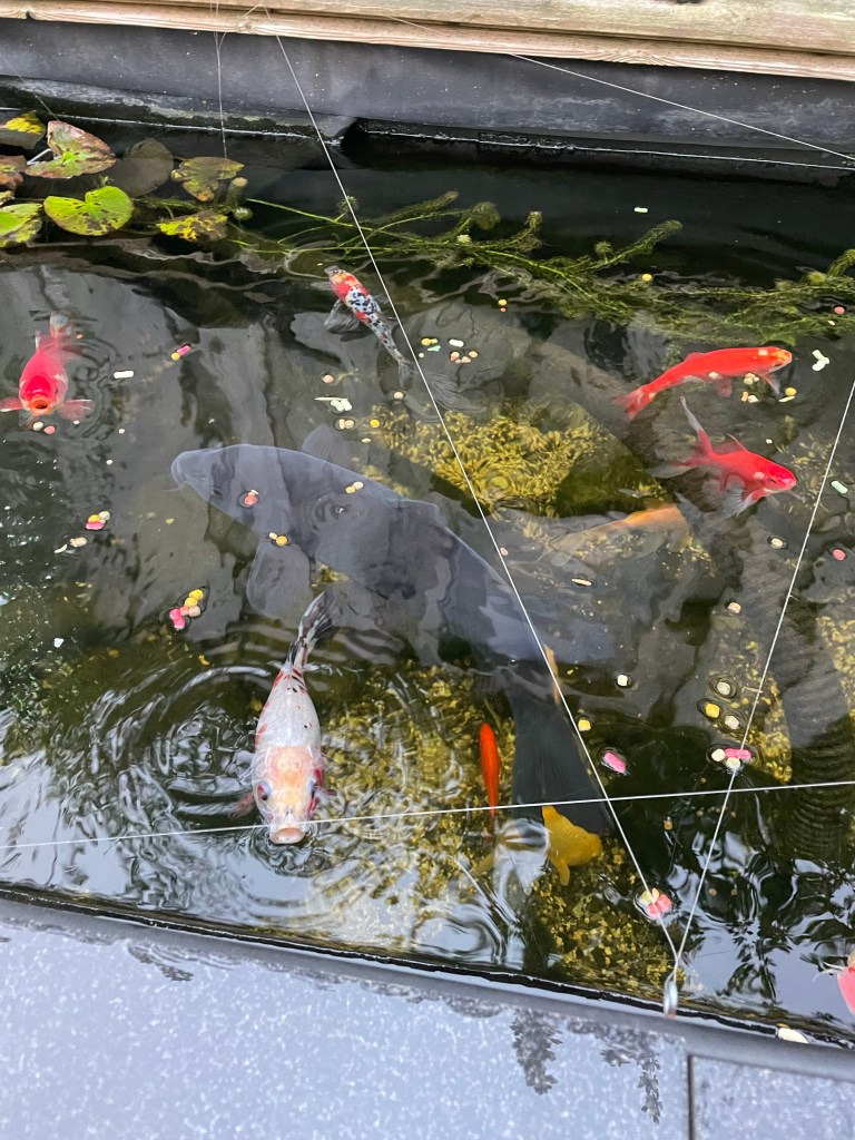 Walter krijgt van ons voor zijn verjaardag onze Black Beauty: de zwarte Koi. Onze vijver is toch te klein voor 2 Kois en de goudvissen en daarom mag hij bij mijn broer in de mega vijver met de grote Kois. Hier is hij de grootste maar daar is hij de kleinste. Hij kwam uit een grote vijver en kan dadelijk weer lekker zwemmen en groter worden. We gaan hem missen maar net als met kinderen moet je loslaten.