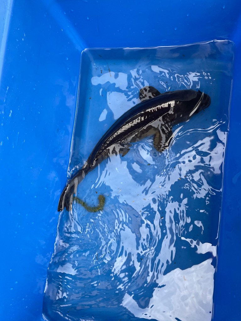 Mijn broer had een speciale Chinese sok ( soort schepnet van doek) maar het duurde toch wel even eer hij Black Beauty gevangen had. Nu is hij dus onderweg naar Numansdorp. De bak hebben we goed gevuld met water en er plastic overheen gedaan zodat hij er niet uit kan springen en straks horen we hoe hij de reis heeft doorstaan. En zien we hopelijk hoe hij daar wordt losgelaten en vrolijk rondzwemt.