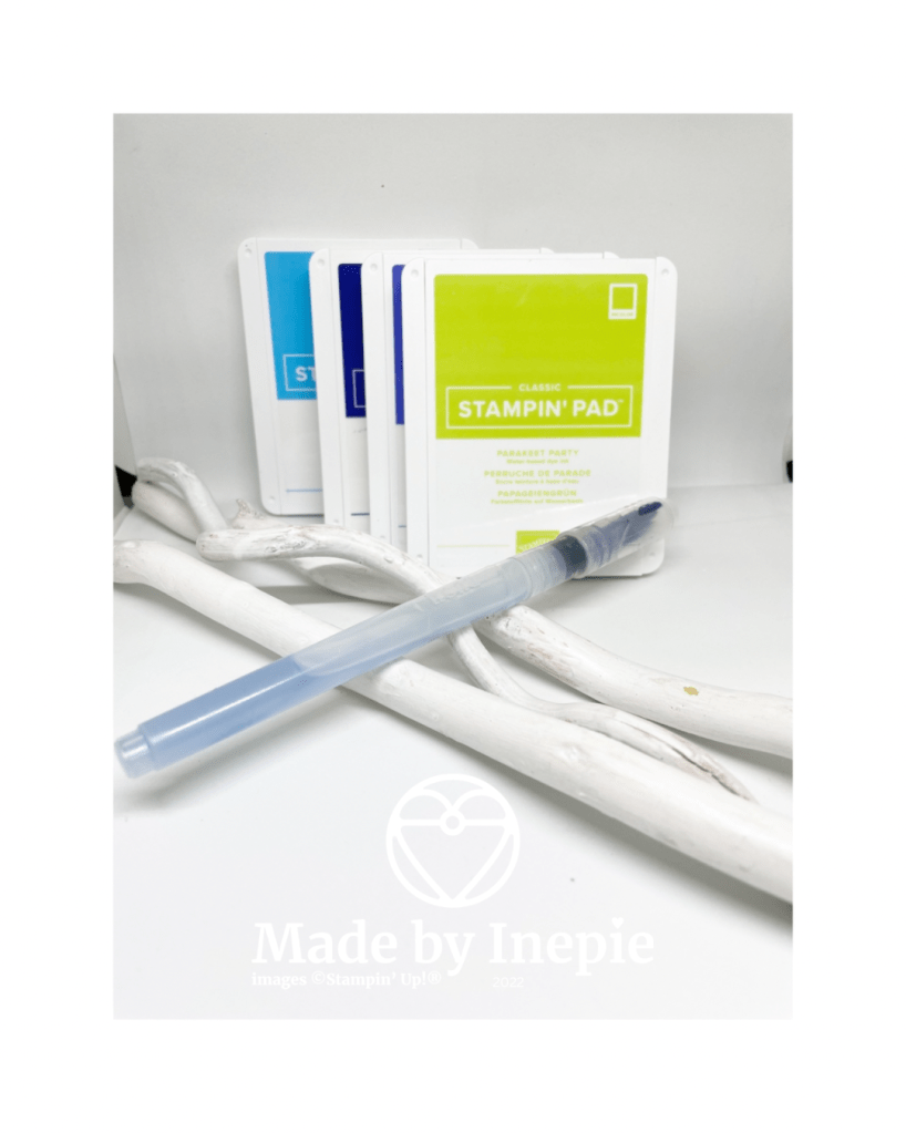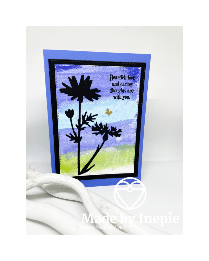 Op een stuk Watercolor paper 4 kleuren inkt aangebracht ( uit de nieuwe In Colors) met een waterpenseel. Daarna dit uitgestanst met de Stitched Rectangles. Nog een stuk Basic Black uitgestanst met de grootste rechthoek en daarna alles op een basiskaart van. Cardstock geplakt. De bloemen heb ik uitgestanst met de Meadow Dies die horen bij de Quiet Meadow stempelset.