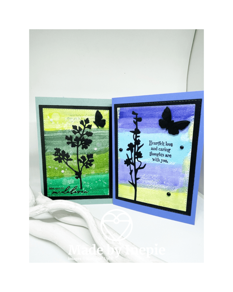 Gisteren had ik helemaal de smaak te pakken en heb ik nog twee kaartjes gemaakt zoals gisteren. Alleen de tweede kaart had ik een andere kleur combi gebruikt. Allerlei groen tinten. Ook erg mooi en andere stansen gebruikt uit de Meadow stansen set.