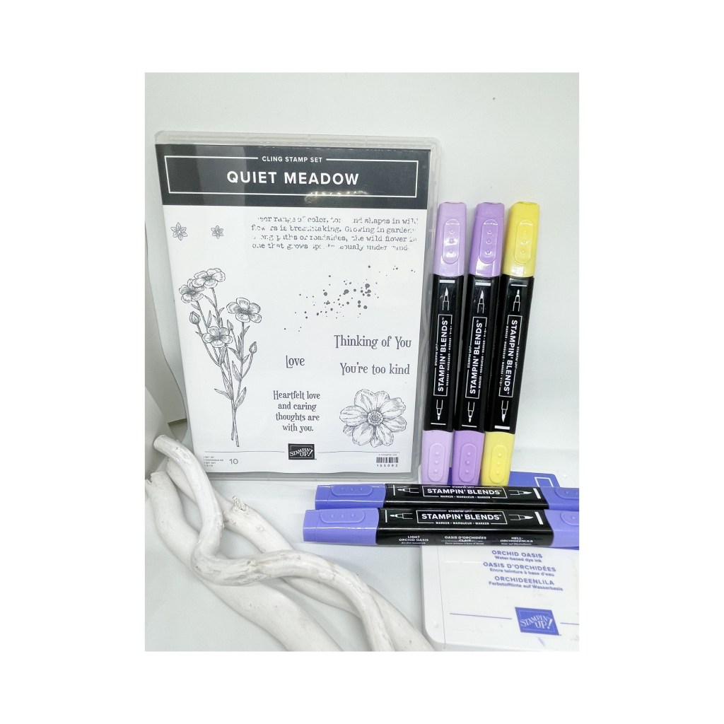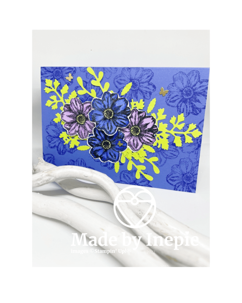 Ik heb de kleuren Dark en Light Orchid Oasis gebruikt en Higland Heather en voor de hartjes van de bloemen Daffodil Delight. Uit Parakeet Party cardstock de takken en mini blaadjes gestanst met de bijbehorende Meadow Dies. En met de Sprig pons ook twee takjes.