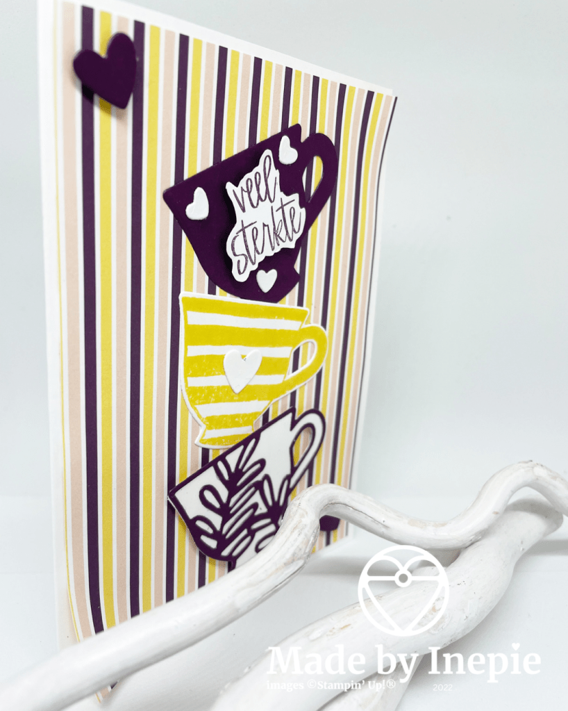 Ik heb een Basic White basiskaart genomen en daarop een mat geplakt van Dsp. Twee hoeken heb ik omgekruld met mijn bonefolder. Hierboven op 3 theekopjes geplakt. 2 verschillende stansen gebruikt . En 1 keer het kopje eerst gestempeld. De hartjes zijn ook stansen uit de Set.