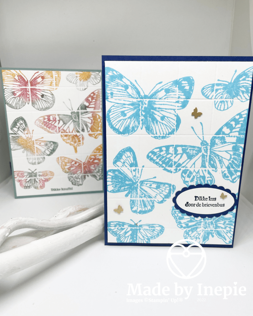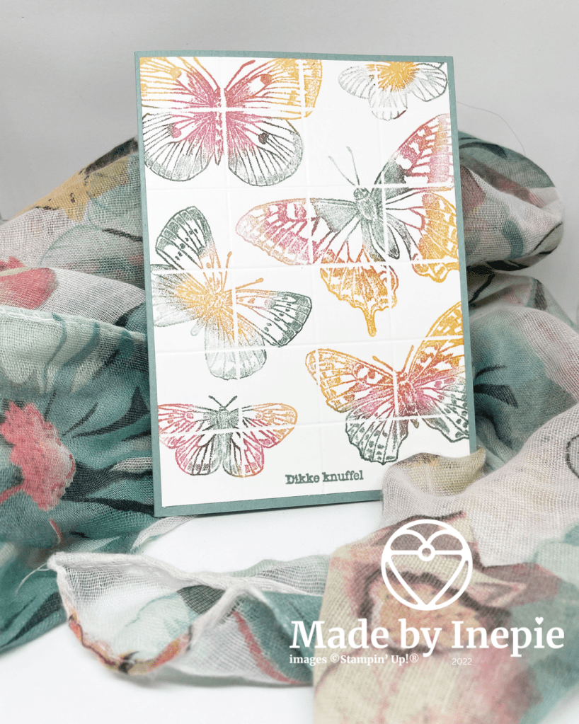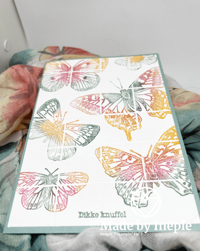 Dit kaartje had ik gemaakt als voorbeeld voor de dames om hun de Faux Tiles techniek uit te leggen. Met mijn Scoring board heb ik iedere 1 inch gescoord verticaal en horizontaal. En daarna met de Stamparatus de Butterfly Brilliance erop gestempeld in Tahitian Tide. Tekst komt uit de Samen Sterk stempelset.