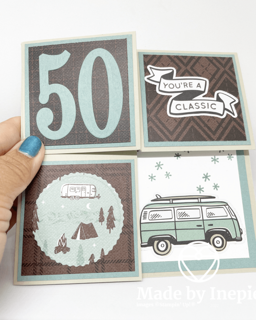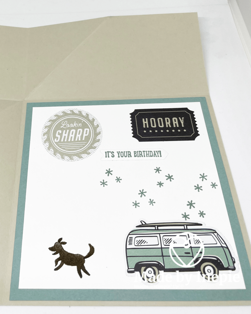 Dit is de binnenkant van de kaart. Ik heb het Dsp van He’s the Man gebruikt. De onderdelen kun je gewoon uit het Dsp drukken. Het hondje heb ik gestempeld want dat moet Indy hun hond voorstellen. Deze komt uit de stempelset Trees for Sale.