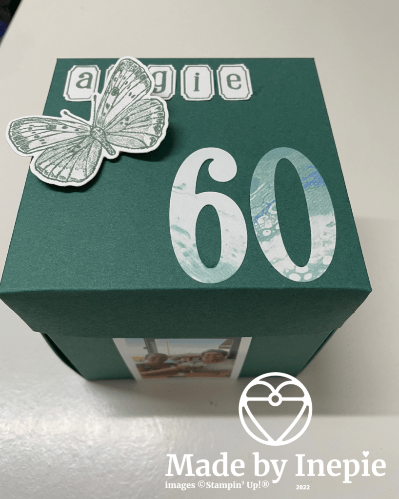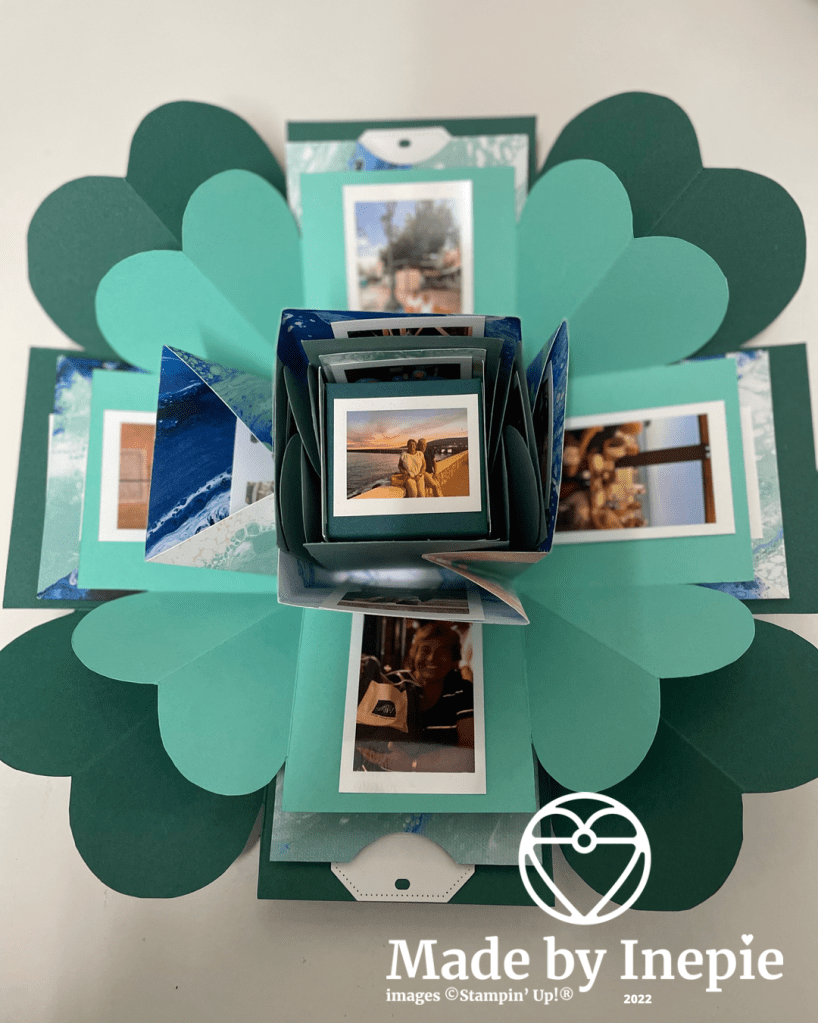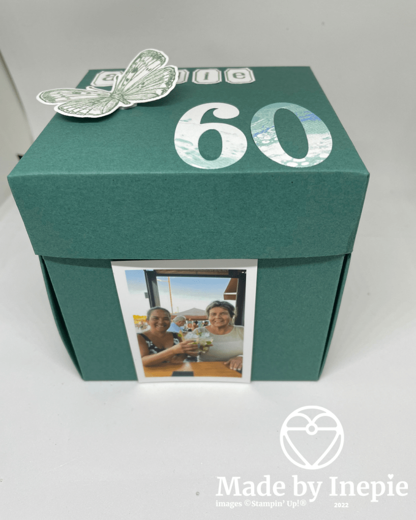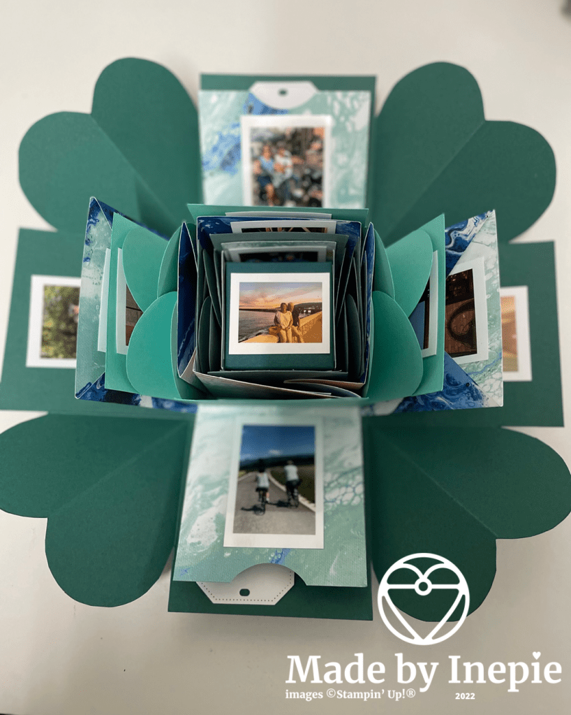 De doos heb ik helemaal versierd met foto’s van onze gezamenlijke vakanties en activiteiten. Heerlijk om alle herinneringen weer op te halen.