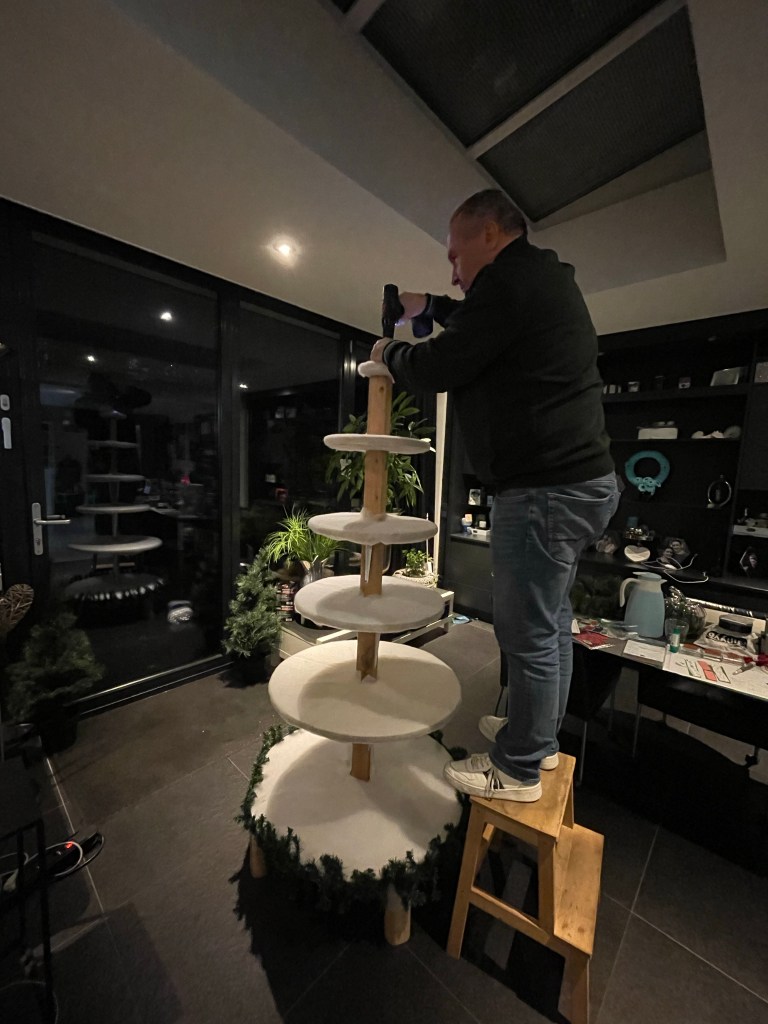 Het is bijna december en omdat ik 3 december mijn eerste Kerst en Kaart evenement heb mag ons Willem al beginnen aan de kerstversiering. Helaas gooide de griep roet in het eten maar vandaag heeft hij grote stappen gemaakt. Mandy had iets gezien op internet en Willem zag dat meteen zitten. Dus werd er gezaagd en geboord.