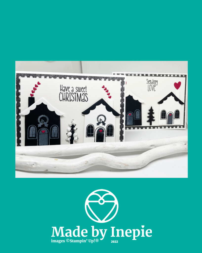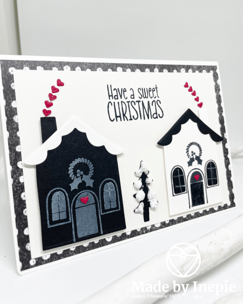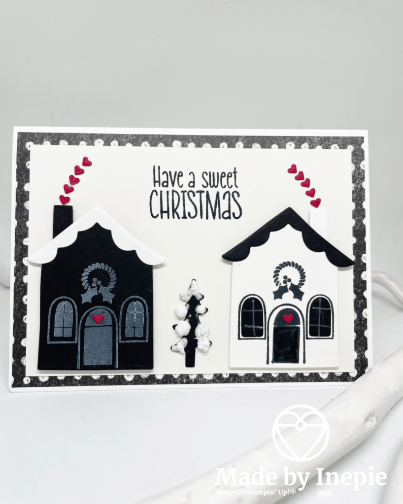 Ik heb een andere tekst gebruikt want ik moet hoognodig aan mijn kerst kaarten gaan beginnen. Dus ook de kerstkransen op de huisjes gestempeld. En wat sneeuw op het boompje gedaan met Puff Paint. Ik vind de kleine hartjes die uit de schoorstenen komen ook erg leuk!