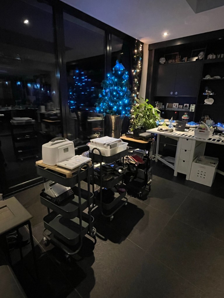 Op mijn rolkarretjes staan mijn Cut & Emboss machine, mijn oude big shot en stempelsets en ponsen.