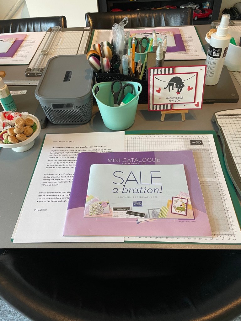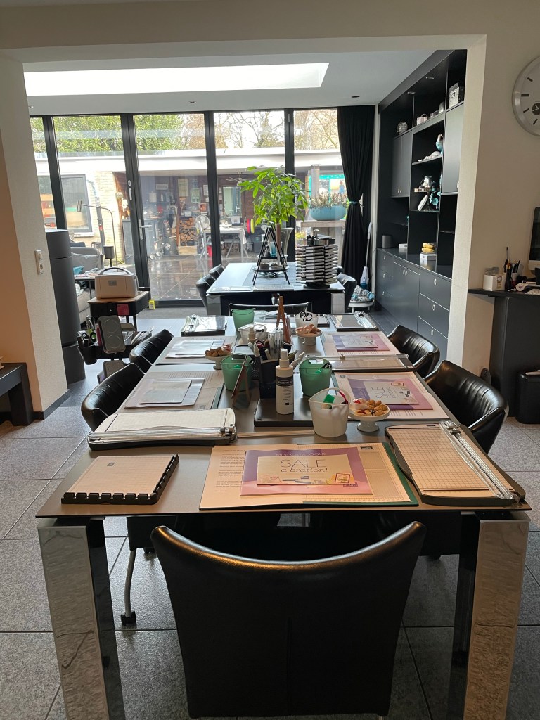 Vandaag mocht ik de tafel klaarzetten voor 5 dames. Helaas moest 1 dame op het laatste moment af zeggen en waren er 4 dames klaar voor weer een middag gezellig knutselen en kletsen. Wat had ik (en gelukkig de dames ook )dit gemist. Dit vind ik echt het leukste deel van mijn job als Stampin’Up! Demonstratrice: het live contact met de klanten.