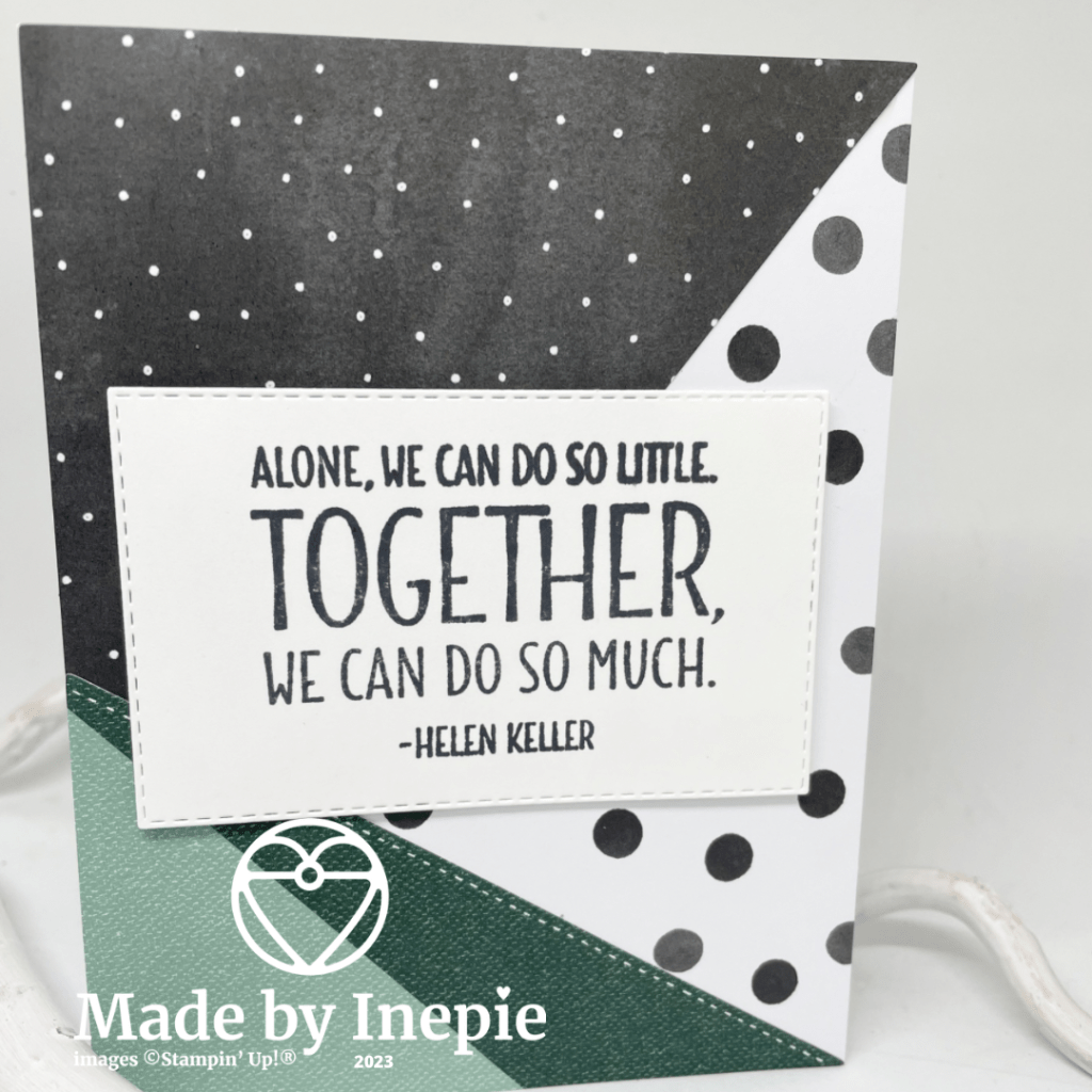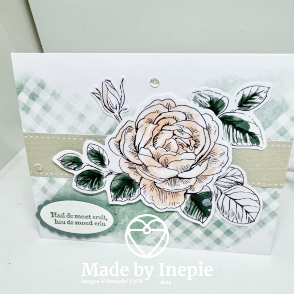 Bij deze kaart ook de basiskaart gemaakt en de mooie grote tekst uit de Steppingstones stempelset uitgestanst met de Gestikte Rechthoeken stansen en met Dimensionals opgeplakt. En dan heb je opeens een heel andere kaart. Ik hou hiervan! En jij?