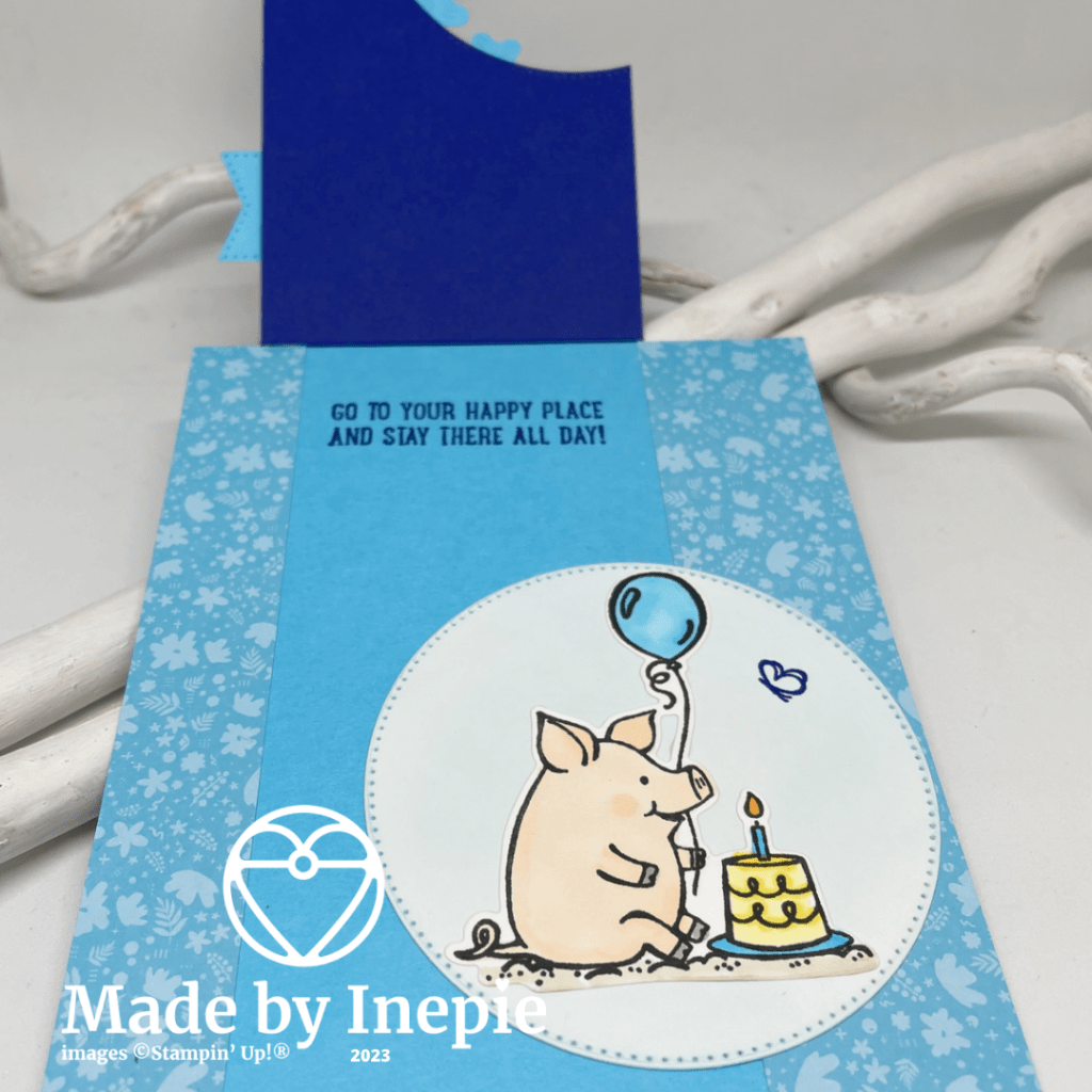 Vandaag hoppen we met 19 teamgenootjes ons thema is deze keer : verjaardag. Onze teamleider Maaike is vandaag jarig dus mijn gemaakte kaartje is voor haar. Het idee zag ik bij Rachel Tessman ik heb alleen de maten naar centimeters omgezet en doordat het varkentje te groot was een grotere cirkel genomen. Over twee weken is onze video hop en laat ik jullie in een YouTube filmpje zien hoe je deze Funfold maakt. Nog eventjes geduld dus.