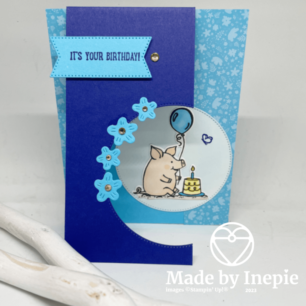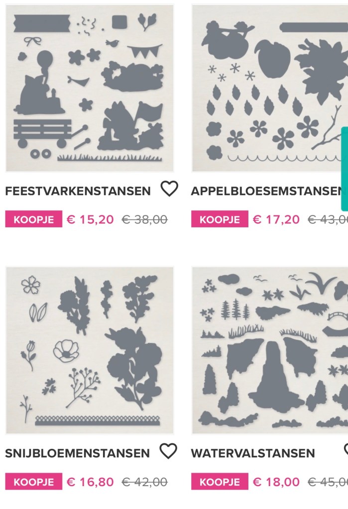 In de koopjeshoek van mijn onlineshop staan de stansen voor de varkentjes nu in de aanbieding. En zoals je kunt zien nog meer mooie stansensets. Superleuk is ook dat je niet alleen de gestempelde varkentjes van de stempelset This Birthday Piggy ( jaarcatalogus pagina 55) uit kunt stansen maar ook de door mij gebruikte bloemen. En een karretje en een halsdoek en slingers. Super leuk!