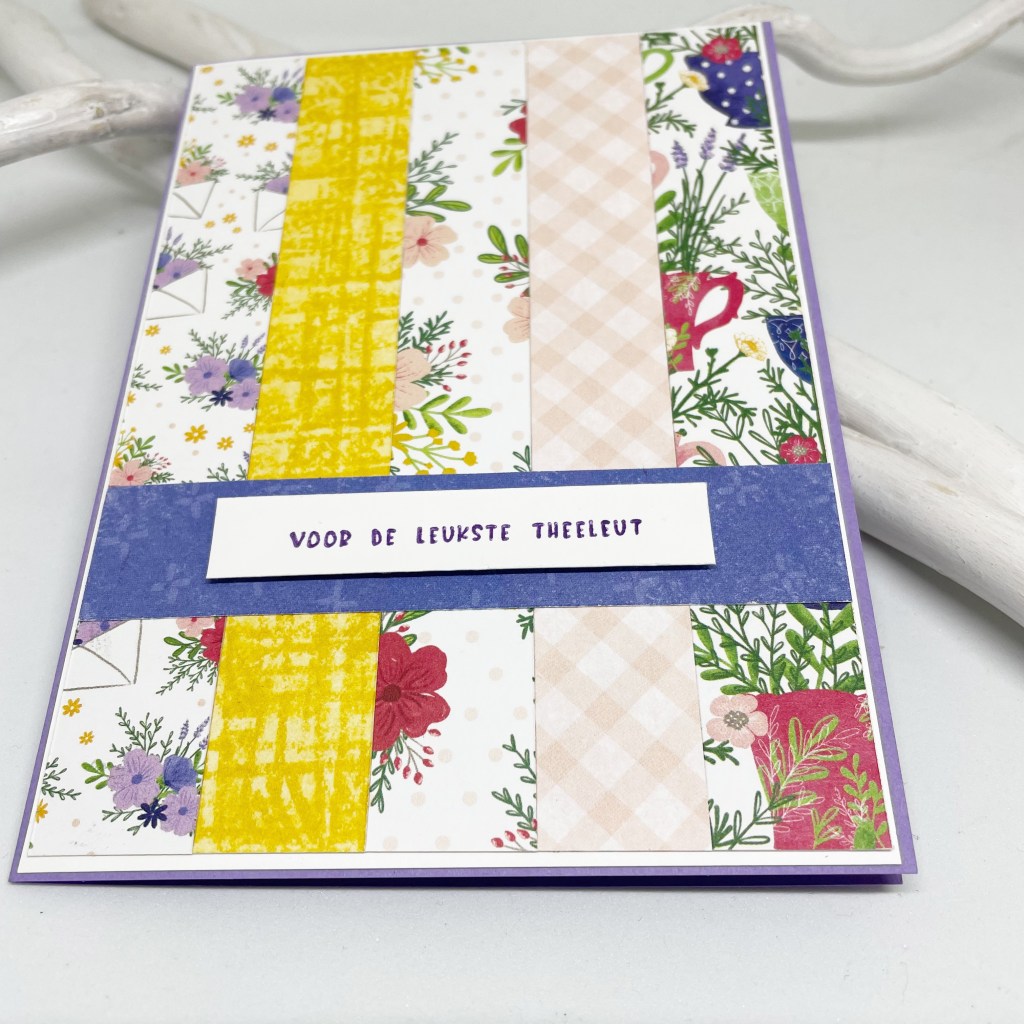 Vandaag een eenvoudig kaartje maar ik vind hem mooi gelukt. Ik heb restjes Tea Boutique Dsp in stroken van 2 centimeter gesneden en op een mat Basic White van 10cm bij 14 cm geplakt.