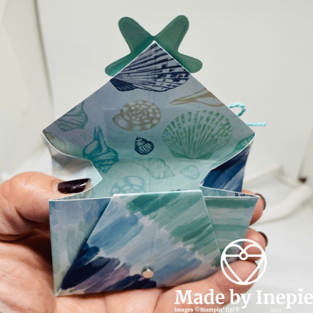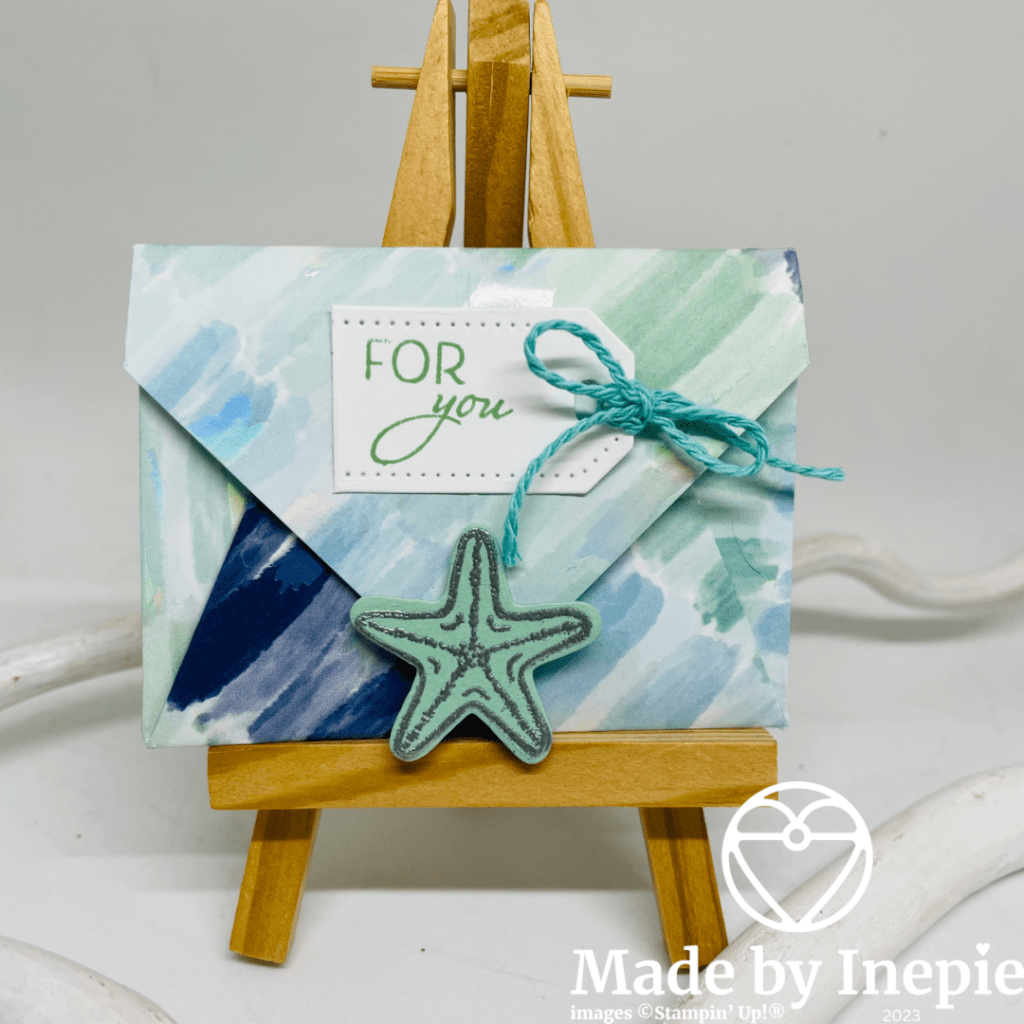 Vandaag heb ik het mooie nieuwe By The Bay Dsp gebruikt. Prachtige kleuren en afbeeldingen. Ik hou van de zee, het is mijn Happy Place. Op Instagram zag ik bij Craftyxgallery deze Origami envelop. Easy peasy en dus deze vandaag gemaakt. Zij had de envelop dichtgeplakt maar ik heb magneetjes gebruikt. Verstopt onder een zeester uit de Friends Are like Seashells stempelset. Deze heb ik met Zilver Embossing poeder ge-heatembossed. Want in het papier zit ook zo’n mooie glans.
