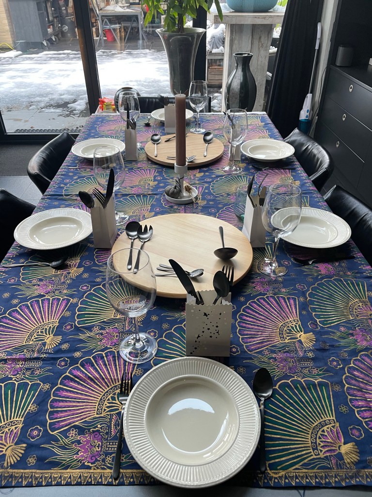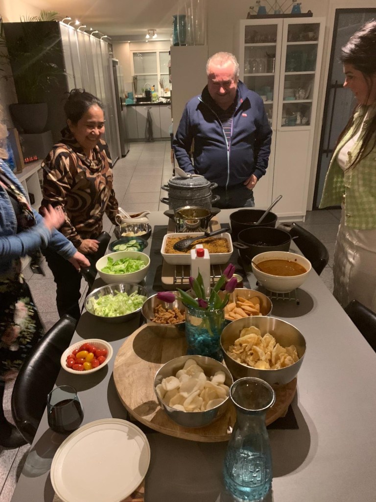 Dus vrijdag naar de Toko en de slager gegaan en de andere benodigdheden gekocht en terwijl Willem in Amsterdam zat voor een nieuwjaars bijeenkomst van zijn werk ben ik begonnen met koken. Indisch koken is niet moeilijk maar gewoon veel werk en mega veel afwas altijd. Vooral de proeflepels haha. Deze keer ben ik vergeten foto’s te maken want tijdens het koken kreeg ik de nood oproep van ons mam. Zes pannen op het vuur, de oven aan en ondertussen bellen met mijn broer, appen met de andere broers en zussen, de zorg gebeld, mijn moeder aan de lijn uitgelegd dat ze de hoorn van de huis telefoon er goed op moest doen en verteld dat hulp onderweg was. Pfff toen Willem om 1.00 uur thuis kwam was ik nog bezig. Gelukkig liep alles goed af met ons mam en heeft ze niks gebroken maar wel veel pijn.