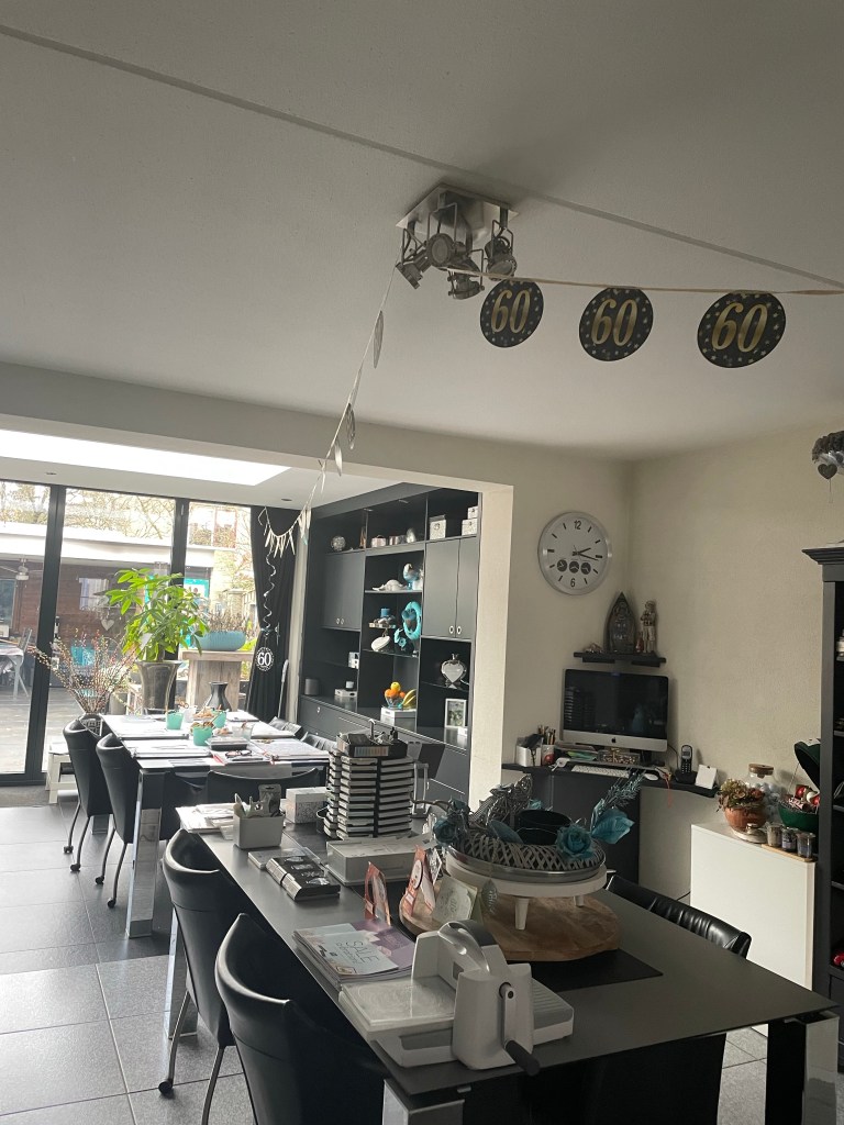 Willem had s’ochtends nog geholpen om de slingers op te hangen en ik had de tafels klaar gezet. Drie dames hadden nog nooit een workshop bij mij gevolgd dus daar moet je dan ook rekening mee houden. De opdracht die ik kreeg was: het moest iets met doosjes zijn. Dus hebben we een explosion box gemaakt. 4 Doosjes die in elkaar passen. Helaas ben ik vergeten om daar foto’s van te nemen.