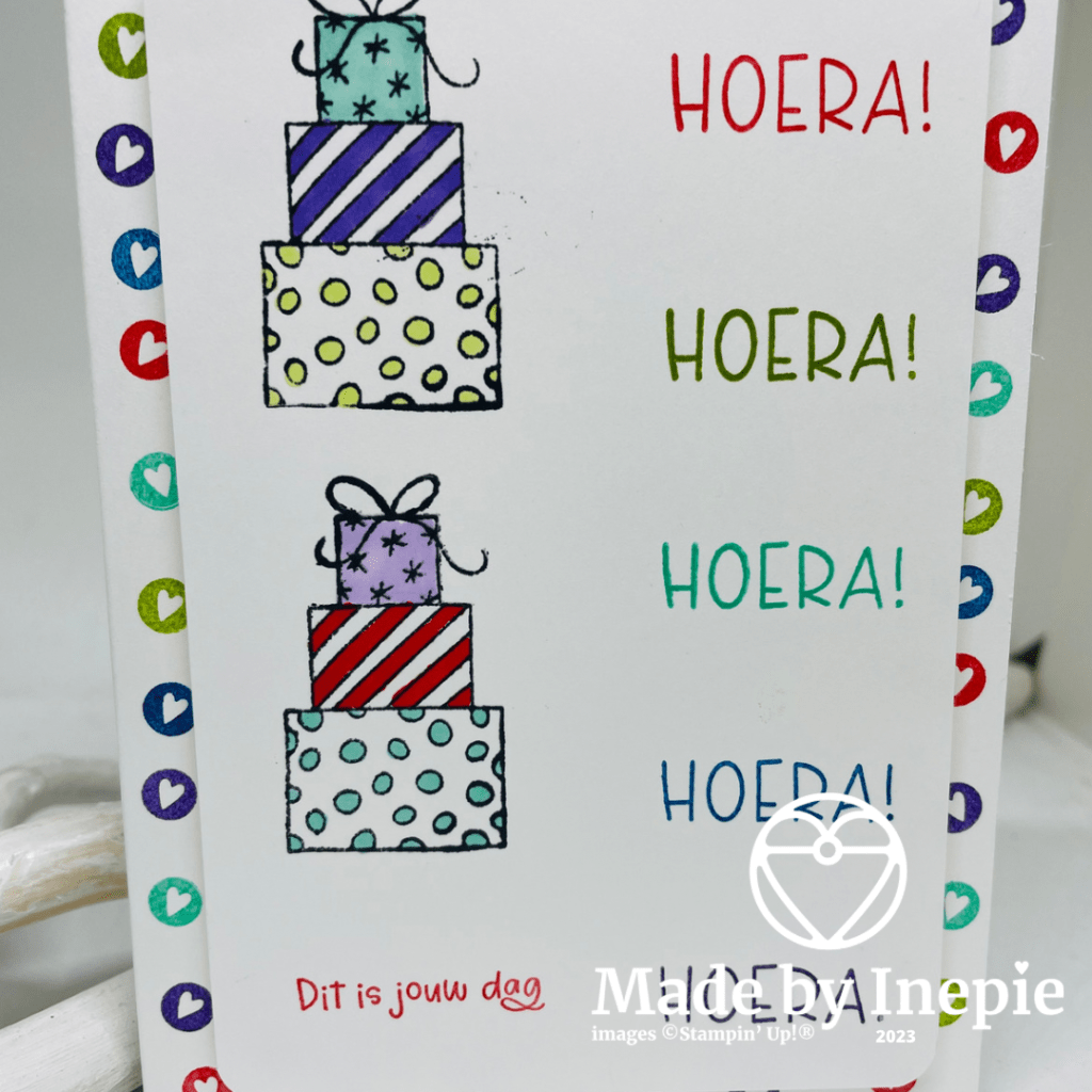 Ik heb op een basiskaart van Basic White de kleine hartjes stempel in verschillende kleuren langs de rand gestempeld. Toen een mat gesneden van 9,5 cm bij 13,5 cm en met mijn Stamparatus de tekst Hoera in verschillende kleuren gestempeld. Poppy Parade, Granny Apple Green, Bermuda Bay, Pacific Point en Higland Heather. Toen de twee taarten gestempeld en ingekleurd met de Stampin Blends en klaar was mijn kaartje. Hier wordt je toch vrolijk van? Ik wel en hopelijk de ontvanger ook. Ik ga 1 februari een verzamel bestelling doen dus geef op tijd jouw bestelling door.