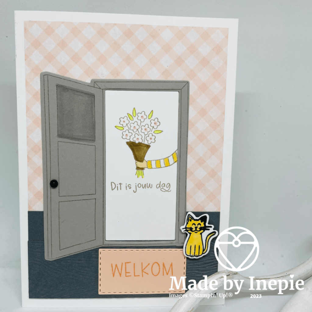 Vandaag dus ook de stansen gebruikt. Zo leuk die deur. En daar kun je natuurlijk van alles achter zetten. Nu deze arm met bloemen gedaan. En dat katje bij de deur en de welkom mat zijn toch ook te leuk.