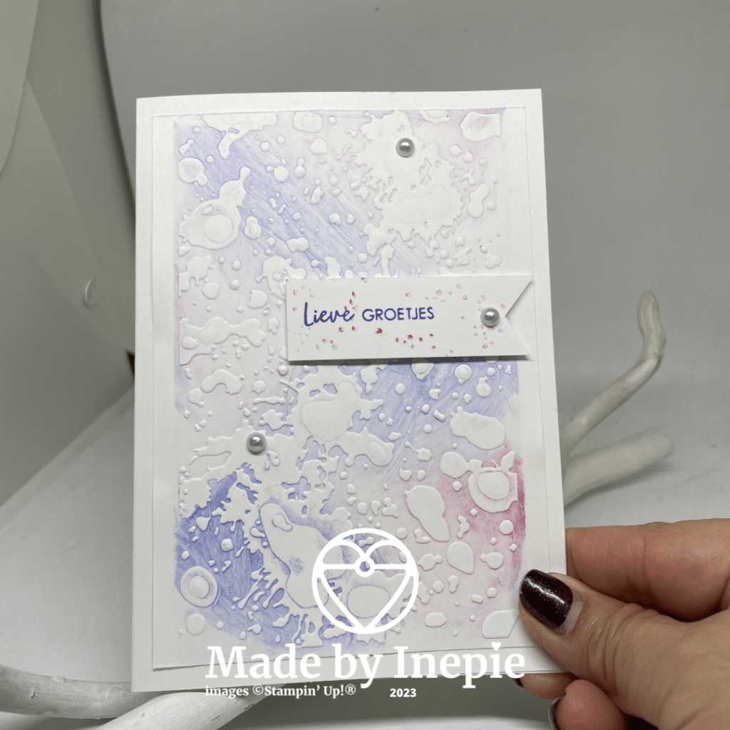 Ik heb er een mat van gesneden en op een basis kaart geplakt. Tekstje gestempeld en wat spatjes erop gestempeld en in banner vorm geknipt en met Dimensionals opgeplakt. Nog wat Pastel Pearls erop geplakt en klaar was mijn kaartje: super leuk toch?! De tekst en de spatjes stempel komen uit de Lieve Bloemen stempelset die je nog deze hele maand gratis mag uitzoeken bij een bestelling vanaf €120,00.