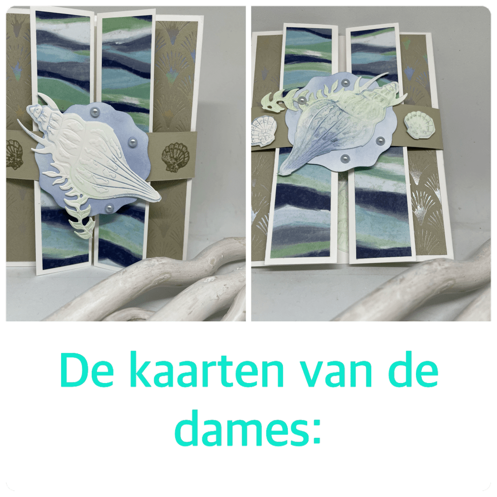 De gebruikte Embossing folder is de Seashells 3D en ik heb ook de bijbehorende Friends are like Seashells stempelset en Seaside Seashells stansen gebruikt. Deze staan in de jaarcatalogus ( bldz 22/ bldz 174 en bldz 177) en heb ik nu gebruikt in combinatie met het mooie By the Bay Dsp. Dit werkelijk prachtige Dsp vindt je in de mini catalogus op bldz 23 maar is in het echt met de prachtige glans nog mooier.