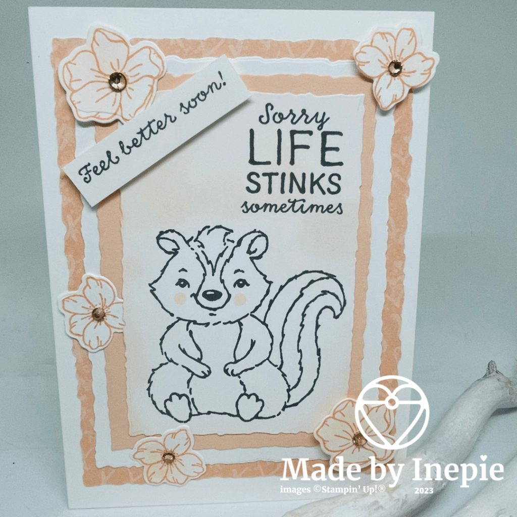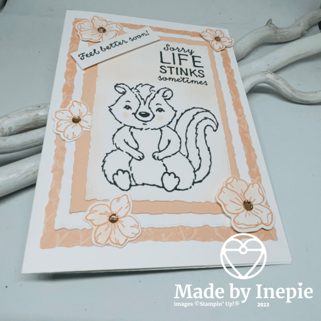 In Volendam had ik de mooie creatieve kit : The Best Remedy bij. Het stinkdiertje is zo schattig! En daar zit dus ook een stempel van bij. Deze heb ik gebruikt op deze mooie kaart. Een lieve klant zit te tobben met haar gezondheid dus maakte ik deze mooie kaart voor haar. Ze houdt van roze dus werd mijn basis kleur Petal Pink.