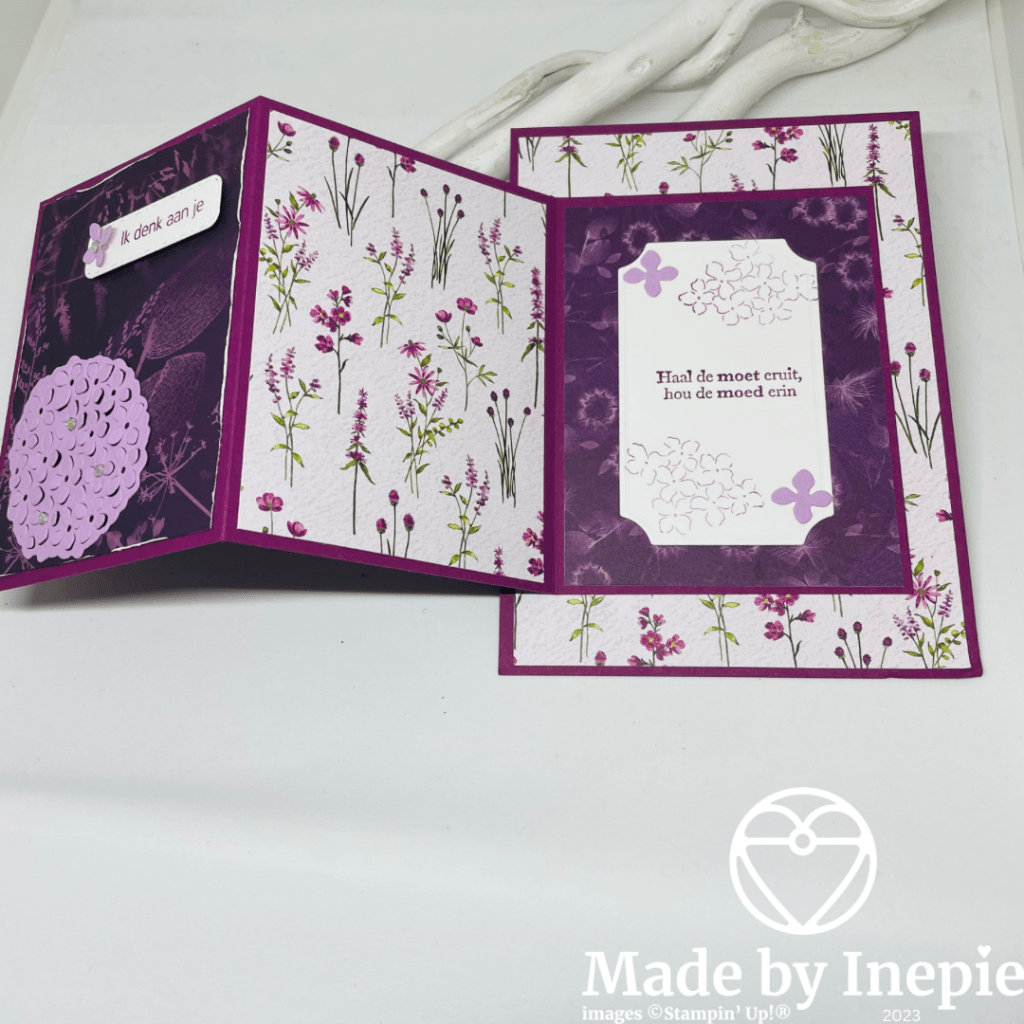 Het papier is retired maar past prachtig bij het Fresh Fresia cardstock van de bloemen. De basiskaart is in Rich Razzleberry cardstock.
