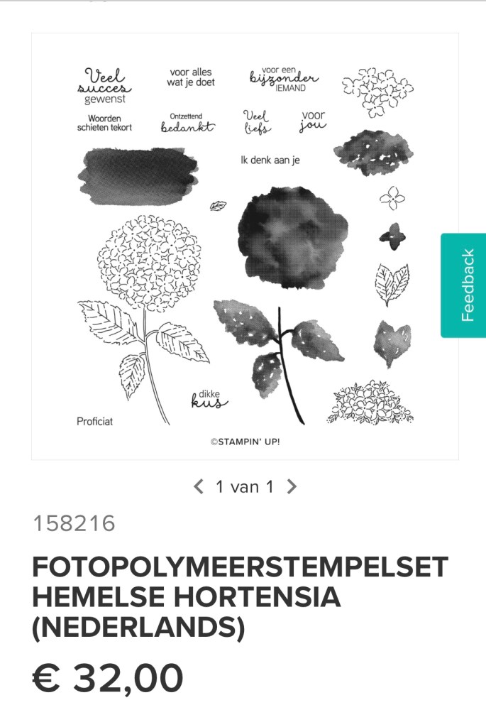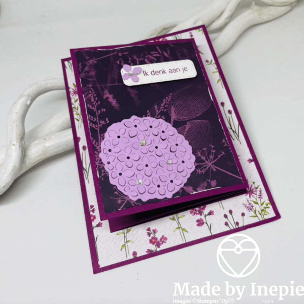 Dit kaartje viel zo in de smaak dat hij twee keer is nagemaakt tijdens onze laatste Koffie en Kaart. Ik heb de stempelset en stansen van Hemelse Hortensia gebruikt. Blijft toch een prachtige set uit de jaarcatalogus.