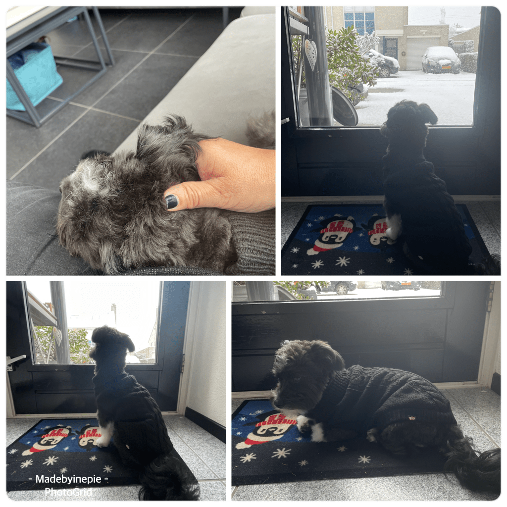 Vandaag werd ik wakker en lag er sneeuw. Daar werd ik niet vrolijk van want ik moest s’middags nog naar Heeze voor mijn nagels. Waar ik wel vrolijk van werd was mijn kleine vriendje. Ik mocht oppassen.