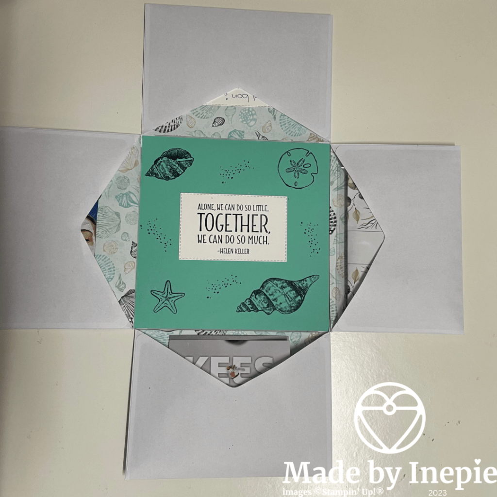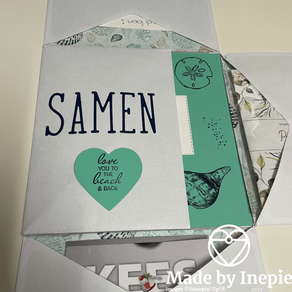 Ik had gepoetst en was eigenlijk te moe maar wilde toch iets moois voor hun maken. Ik zag op instagram bij Studio Ziehe een explosion envelop. Gemaakt van vier enveloppen en die heb ik op mijn manier nagemaakt. Mandy en Gert-Jan zijn dol op de zee dus wist ik meteen welk Dsp ik ging gebruiken: By The Bay.