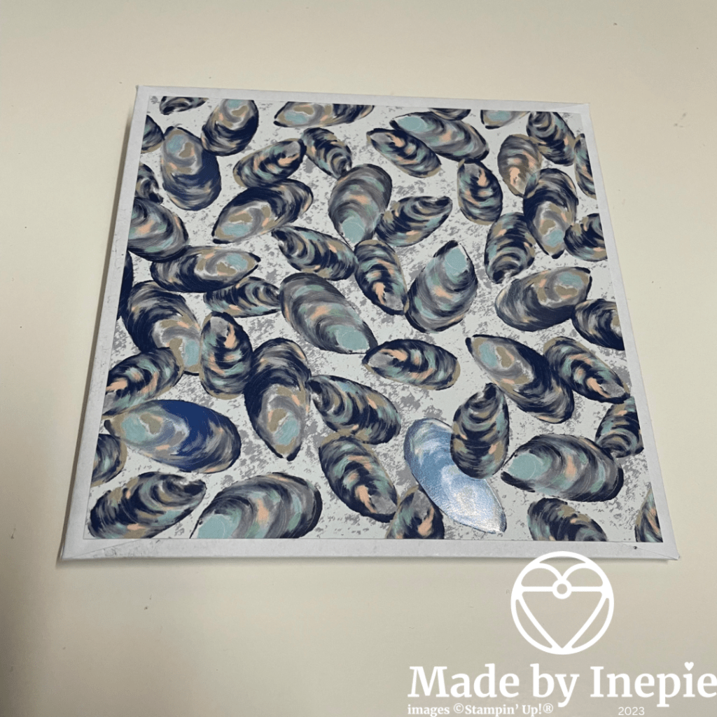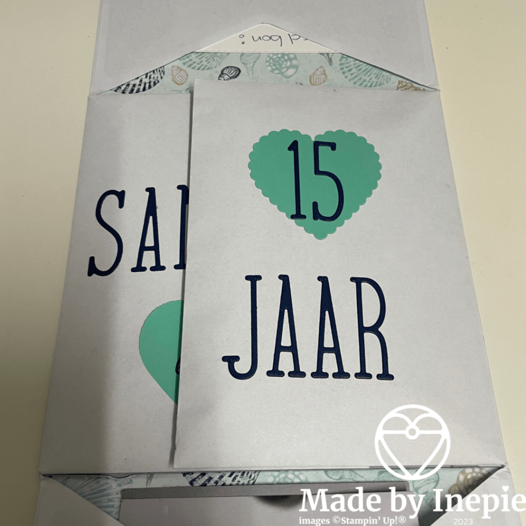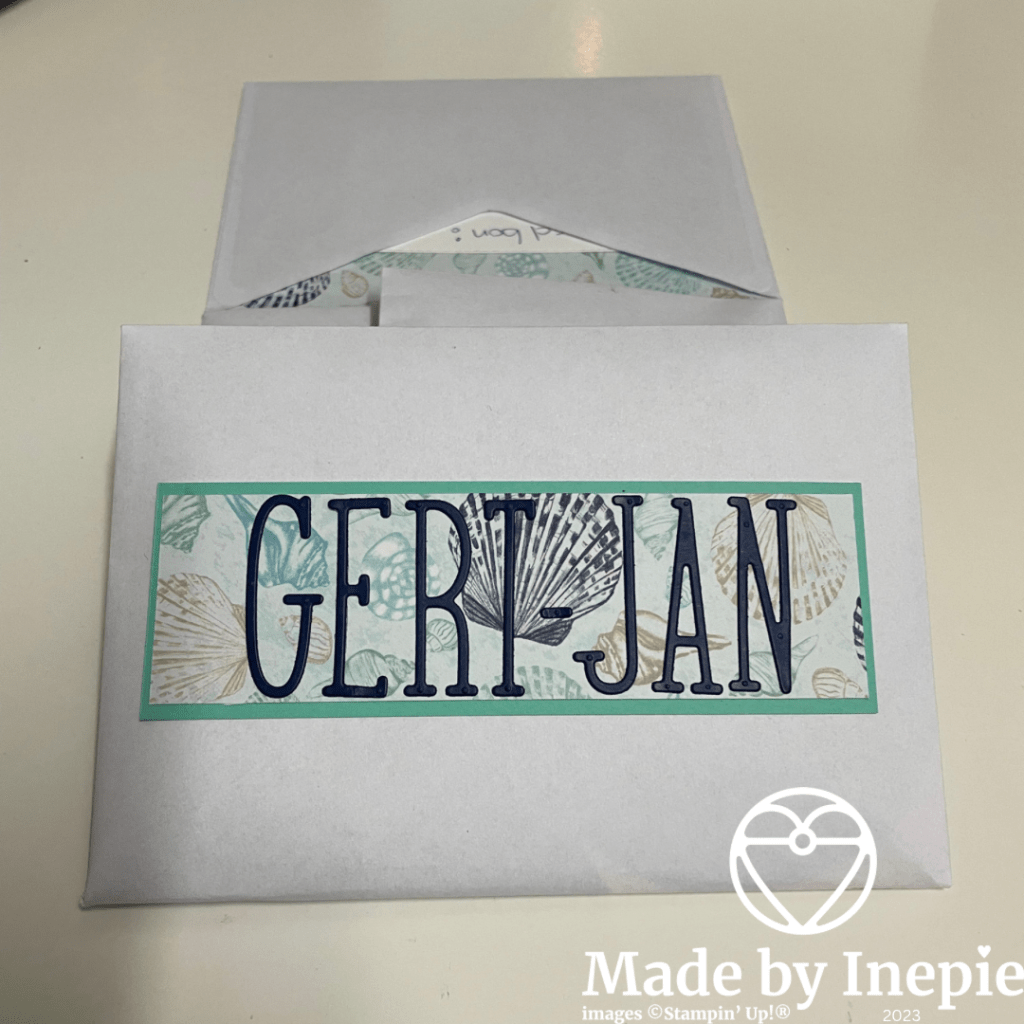 Deze tekst komt uit de mooie stempelset Stepping Stone en heb ik uitgestanst met de Stitched Rectangles. De schelpen heb ik gestempeld met Night of Navy inkt. In de enveloppen heb ik driehoekige stukken Dsp geplakt.