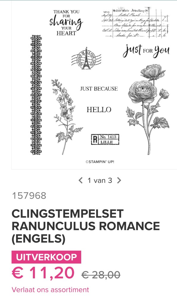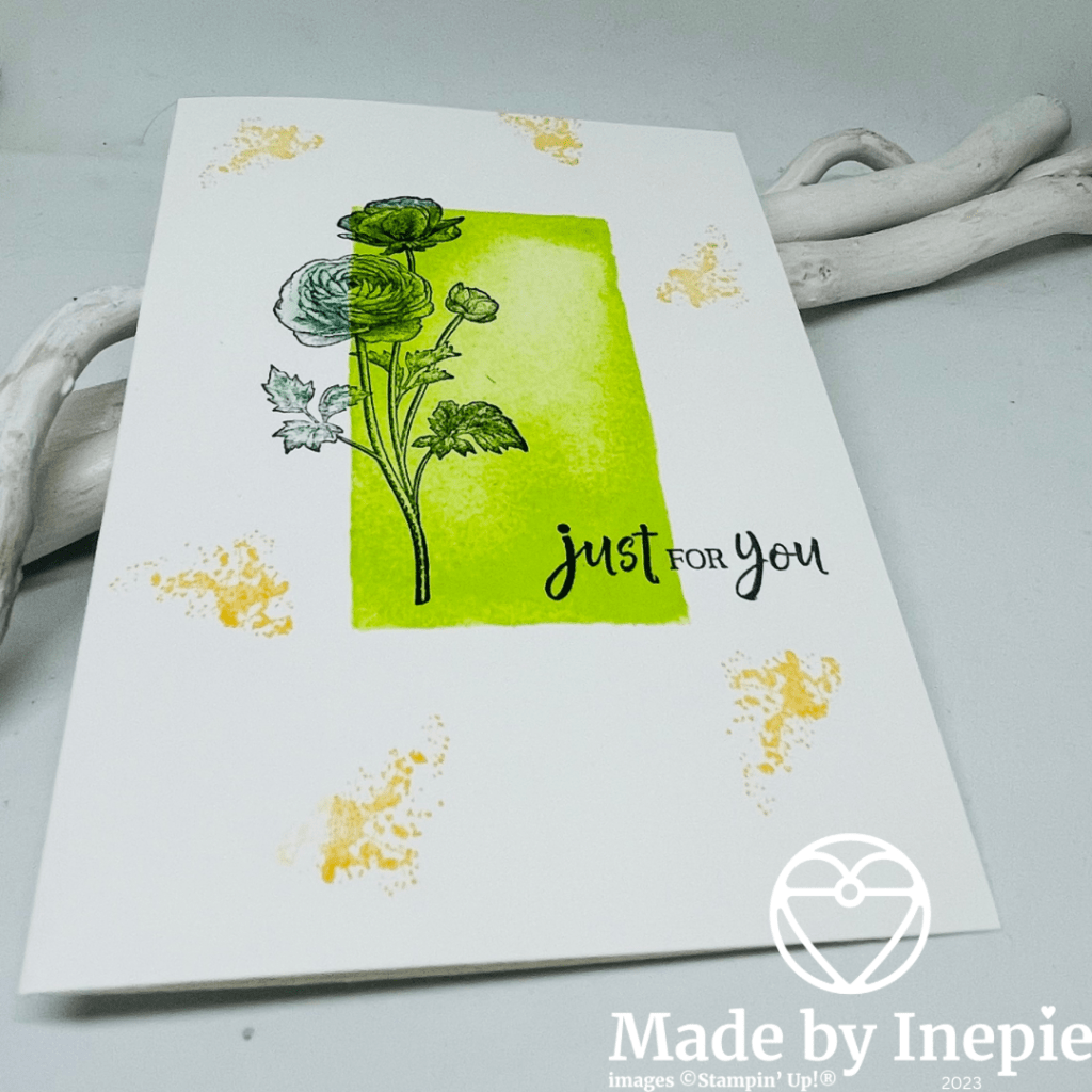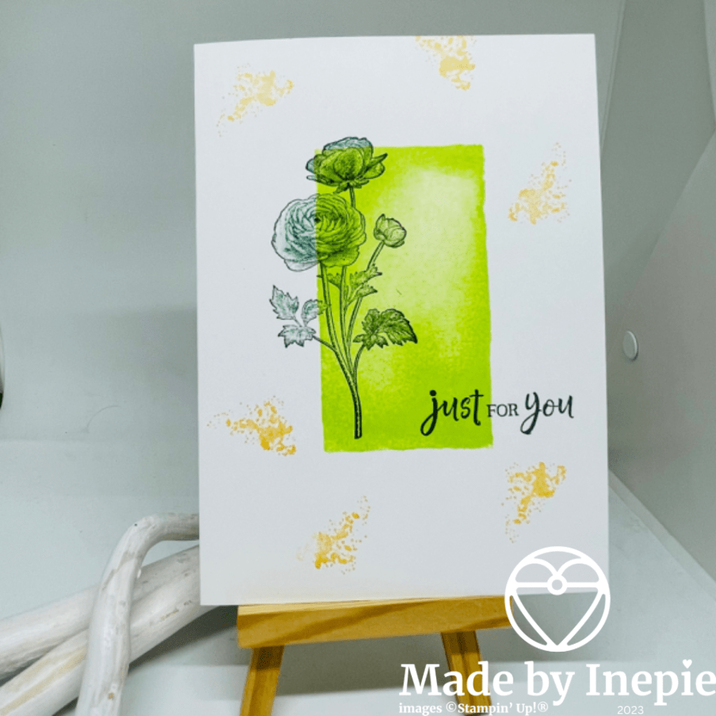 Met de ook helaas retiring kleur Evening Evergreen heb ik de mooie bloem gestempeld en de tekst uit de stempelset: Ranunculus Romance. En ja deze gaat helaas ook weg. De verf vlekjes komen uit de stempelset Painted Poppies en ook die gaat ons verlaten. Maar daar gaat geen korting vanaf. In mijn webshop zie je precies wat je nog kunt bestellen. Als iets op is wordt het meteen van de site gehaald.