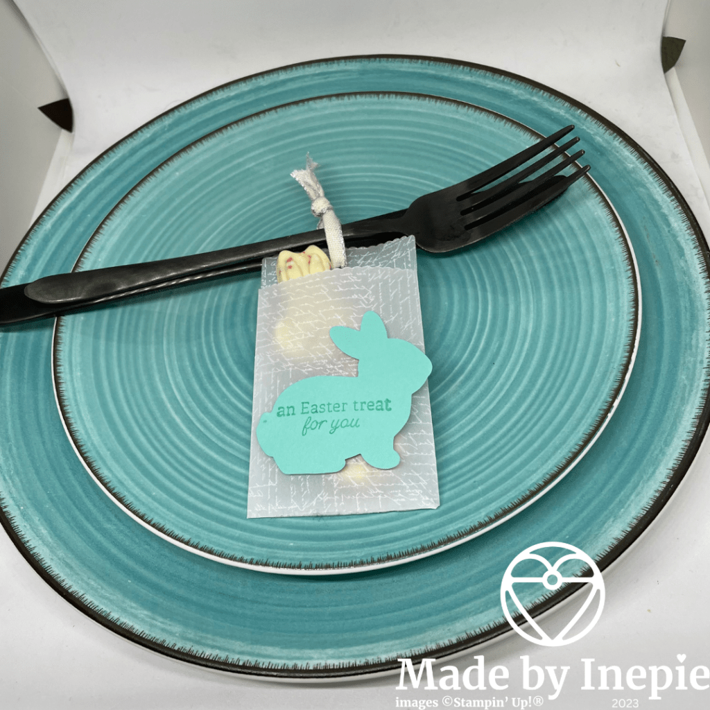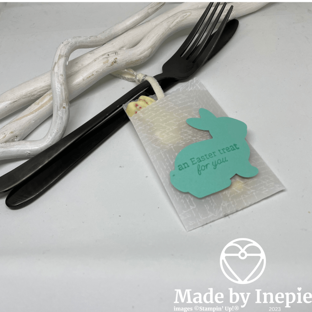 Ik wilde sowieso iets voor Pasen maken en opeens kreeg ik dit leuke idee. Ik had bij de AH leuke Disco haasjes gekocht en met de Mini Pocket Envelop stans maakte ik deze leuke envelopjes. Ik gebruikte het mooie bedrukte vellum Layering Designs. Daarop plakte ik met dimensionals een geponst konijntje waarop ik de tekst had gestempeld: an Easter treat for you. Ik ponste een gaatje aan de bovenkant en haalde daar een stuk Mettalic Edge Cotton Ribbon door. Deze hing ik aan het bestek en zo had ik een mooie versiering voor op de borden.