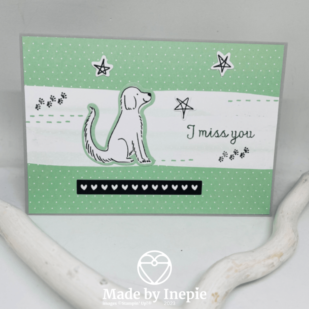 Vandaag moest ik een niet zo makkelijk kaartje maken. Ik kreeg een appje van mijn vriendin dat het niet goed ging met hun hondje Bowie en dat ze hem s’middags zouden laten inslapen. Ik ken hem natuurlijk ook al heel lang hij was 12 jaar bij hun. Als we gingen wandelen, Corrie en ik, dan haalde ik haar op en moest hij altijd blaffen en mij groeten. Vandaag blafte hij niet. Maar hij lag op de bank en kwam mij toch groeten. Zo lief! Hij was mager geworden en trilde over heel zijn lijfje dus het is de beste beslissing maar wat zal hij gemist worden. Ik wilde toch een kaartje maken en gelukkig had ik al de memories and more kaartjes klaar liggen.