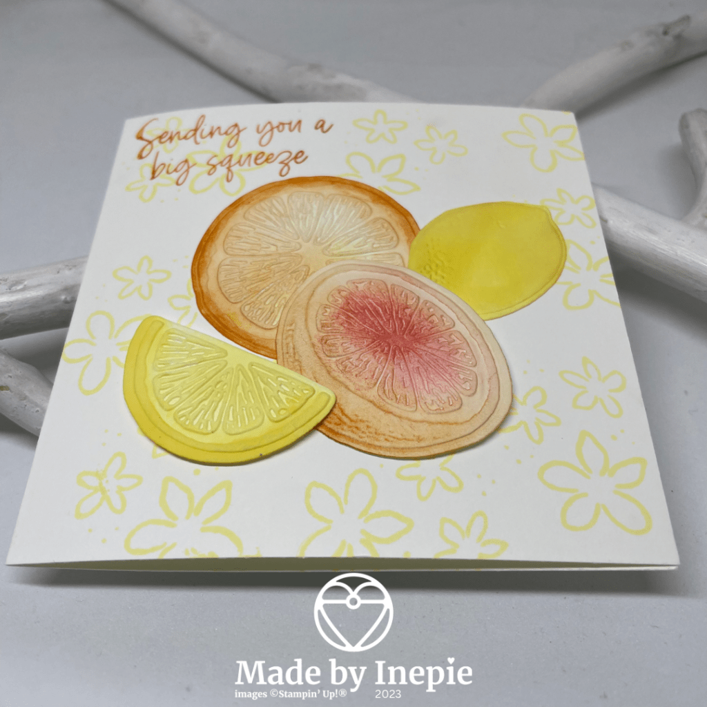 Kijk hoe diep de Embossing folder reliëf aanbrengt. Ik heb kleur aangebracht met de mini Blending Brushes. En de vruchten daarna met Stampin Dimensionals opgeplakt.
