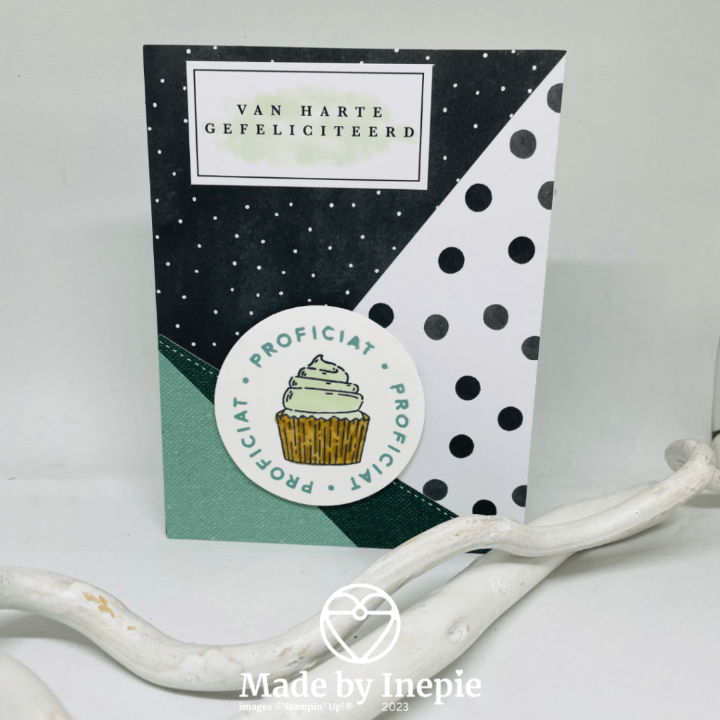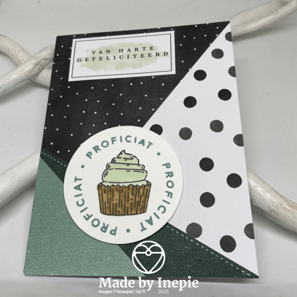 Ik heb eerst de cirkel tekst gestempeld in Lost Lagoon en toen met Memento Tuxedo Black het ijsje. Deze heb ik met de Stampin Blends en Soft Seafoam ingekleurd. Om de Soft Seafoam terug te laten komen heb ik over de tekst Van harte gefeliciteerd nog wat gekleurd met de Soft Seafoam Stampin Blend. Lekker uit de losse pols.